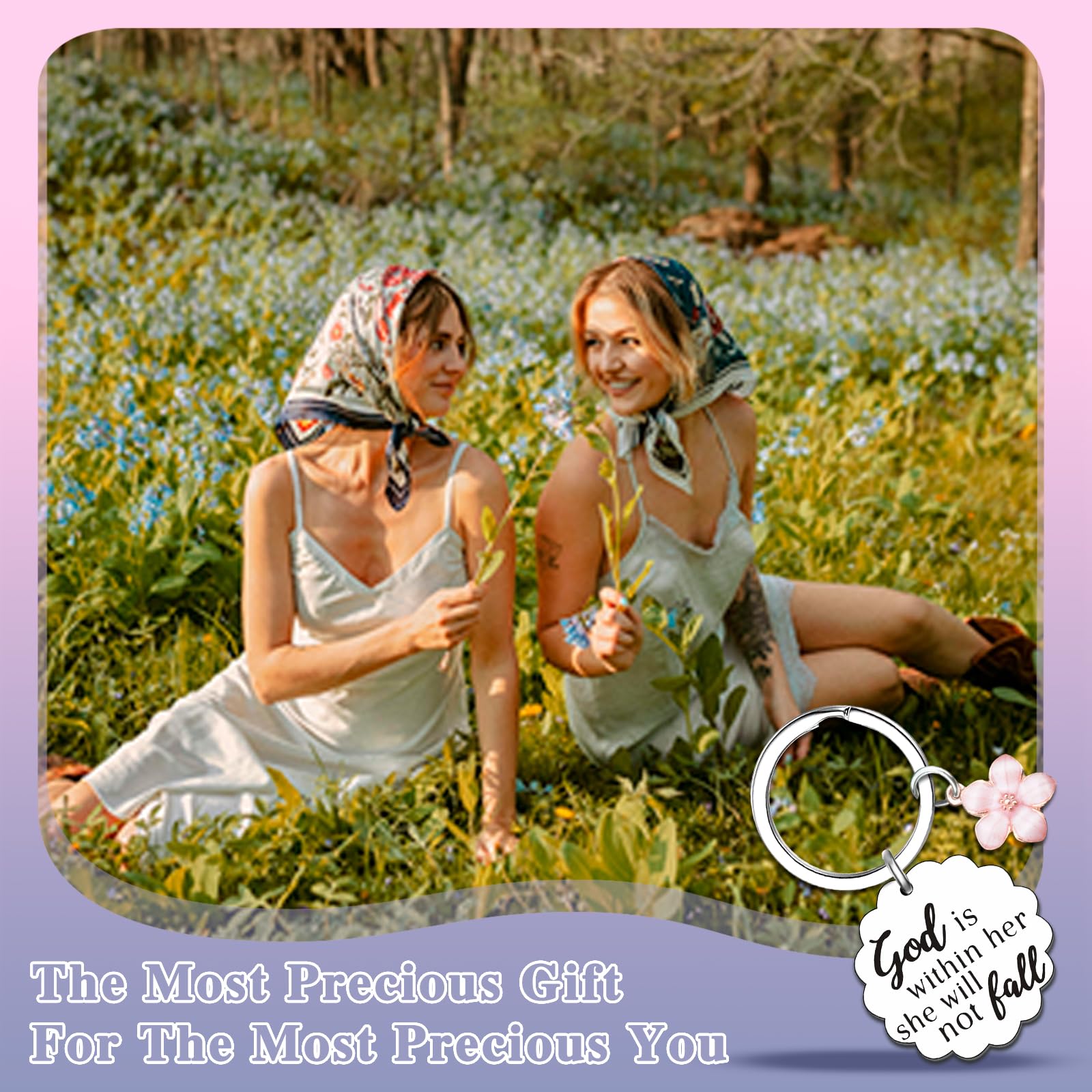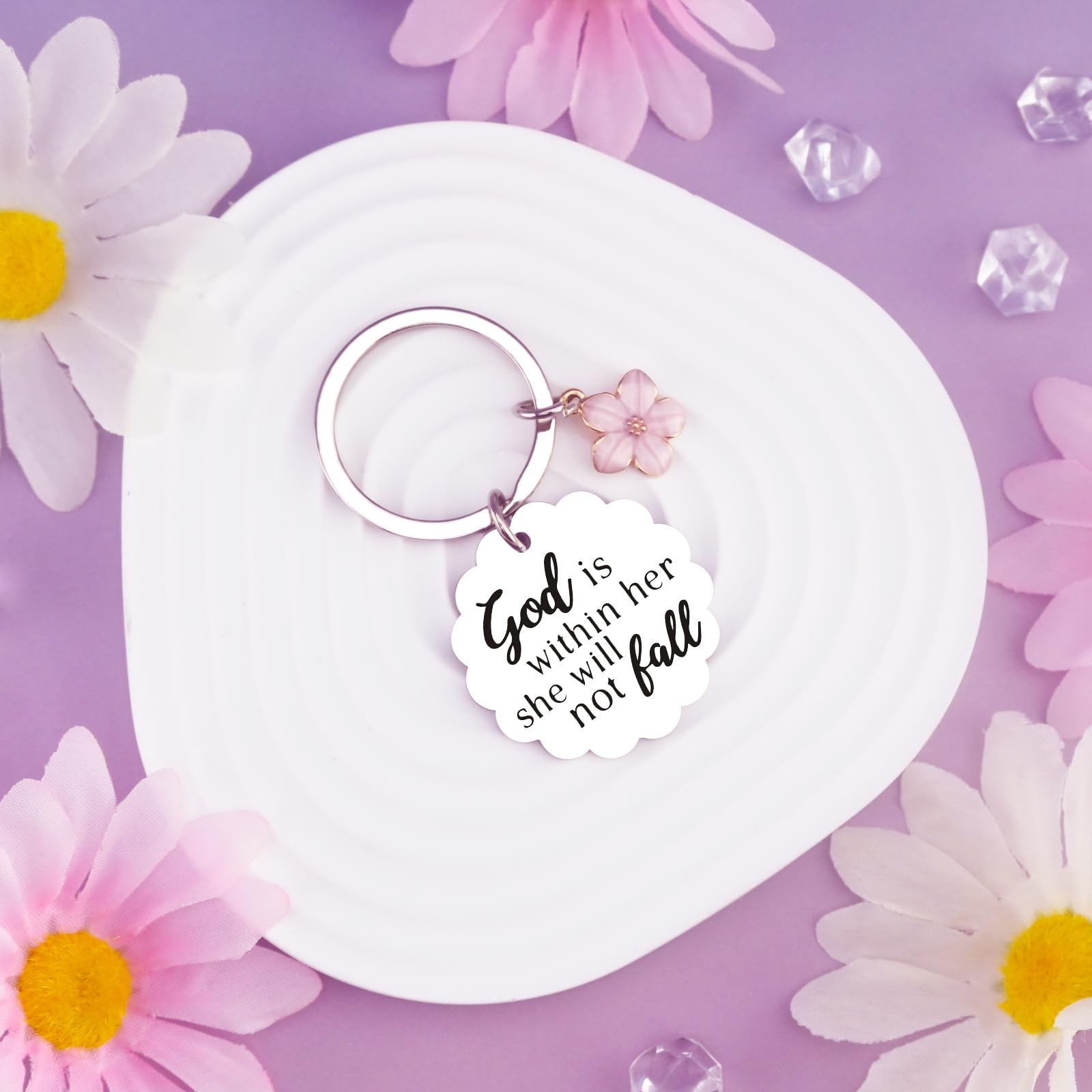 Galentines Day Gifts/ Faith Based Gifts For Women: This bible verse keychain for women with flower-shaped with the bible verse "God Is Within Her, She Will Not Fall" matching a pink flower. This bible verse keychain will encourage women when she is facing a difficult time