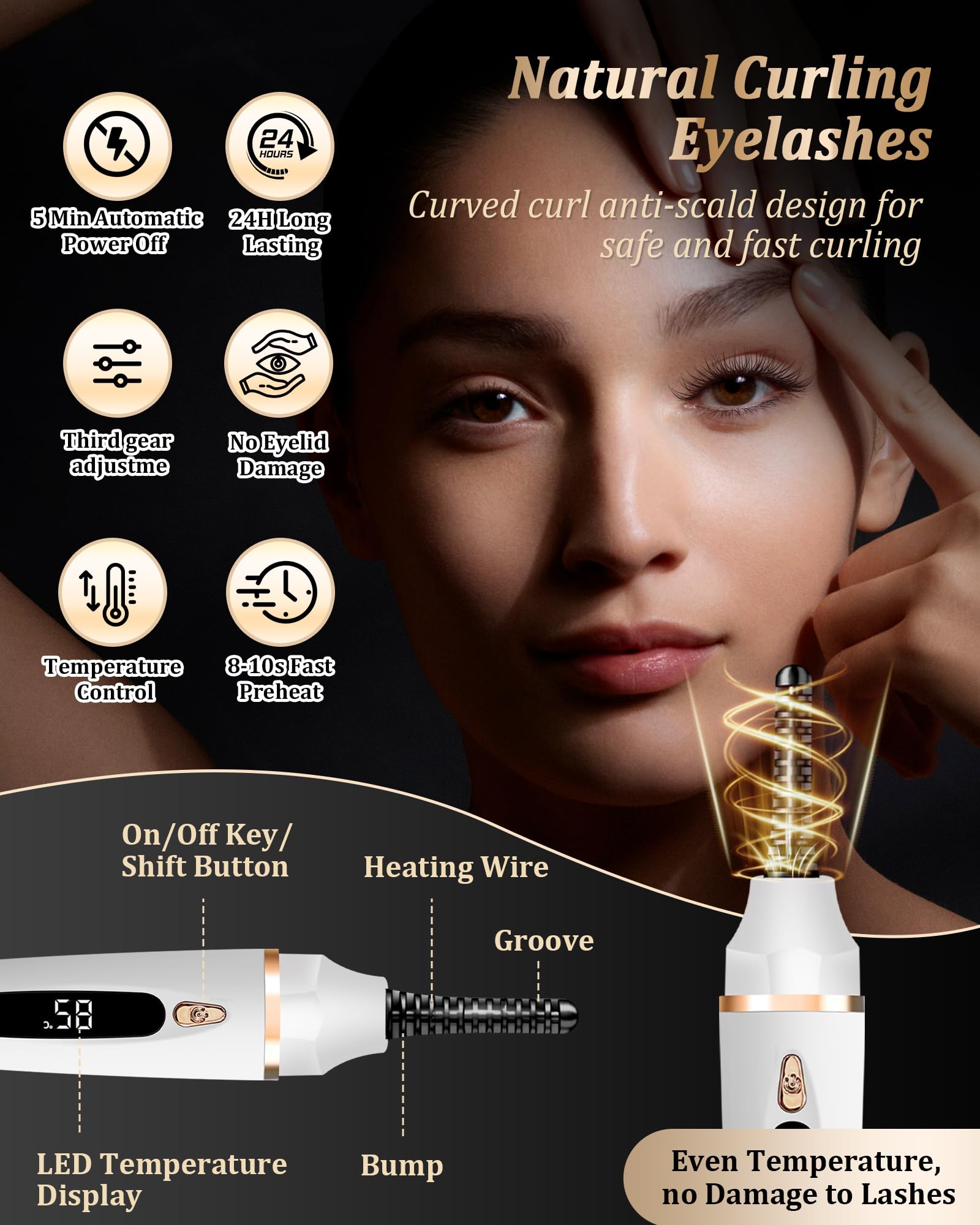 Are you troubled as your eyelashes are not curled enough? Are you still troubled that traditional eyelash curlers cannot achieve the expected effect? Are you just in a hurry looking for an affordable way to give your lashes a nice curl? Don't worry! Our BeautyCurls Heated Eyelash Curlers can help you! Why choose us? 🥰The advanced heated eyelash curlers provides 3 temp options with LED display, from 65°C (149°F) to 95°C (203°F), there is always a temperature suitable for you 🥰Using an ergonomic 15° curved anti-scalding comb, the heated lash curler with dual-purpose brush head can perfectly fit the curve of the eyelashes 🥰Using a new type of fast heating material, the heated eyelash curler set can be preheated in seconds within 8~20s 🥰Smart power off within 5 minutes, no key operation required, allowing you to use the heated eyelash curler safely and worry-free, 🥰 Small size, USB charging, take it anytime, anywhere, natural curling eyelashes for more than 24H. ⚠Important Note: When using a heated eyelash curler for the first time, you can feel the temperature with your hands before using it, so as not to cause eye and face discomfort due to high temperature. But don't worry, the heat protection slot makes it safe to use, and won't hurt your eyes. ⭐Five-star after-sales service: We are committed to providing you with a long-lasting curled eyelash! If you are not satisfied with the quality of our heated eyelash curler product, please feel free to contact us via Amazon message, the professional team will serve you wholeheartedly!