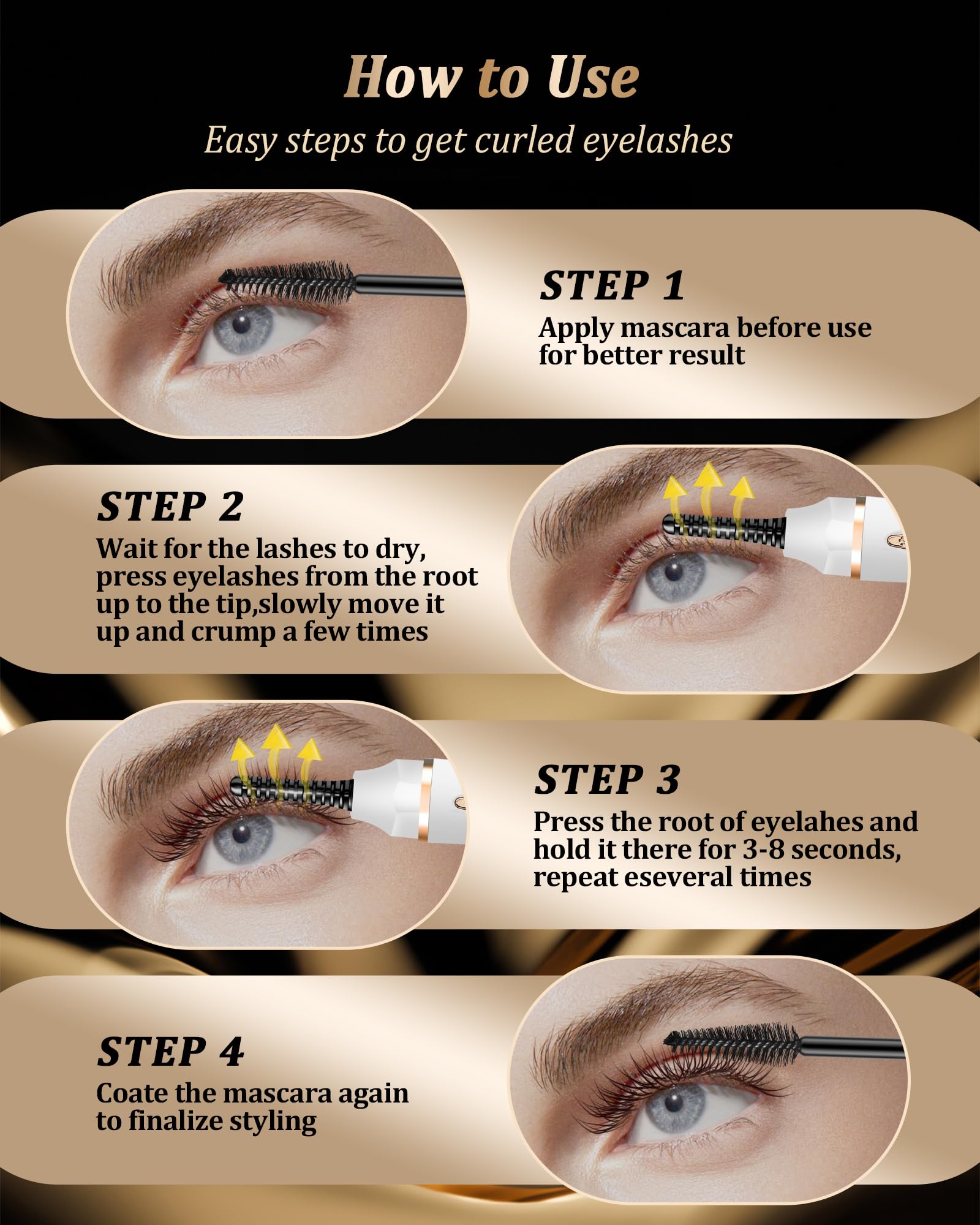 【Usage Tips】Make sure the Eyelash Curler is fully charged for 1-2 h before using it for the first time. It is recommended that you practice and familiarize yourself with the operation of the curler before trying it for the first time. For more effective curling of eyelashes, please take care to apply mascara before using the curler for better heating and styling of eyelashes. After curling your lashes, apply mascara to enhance the curling effect for a natural curl and longer-lasting results.