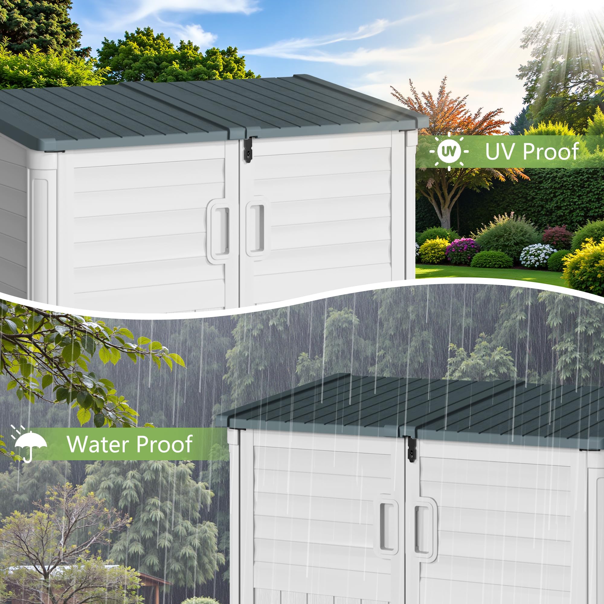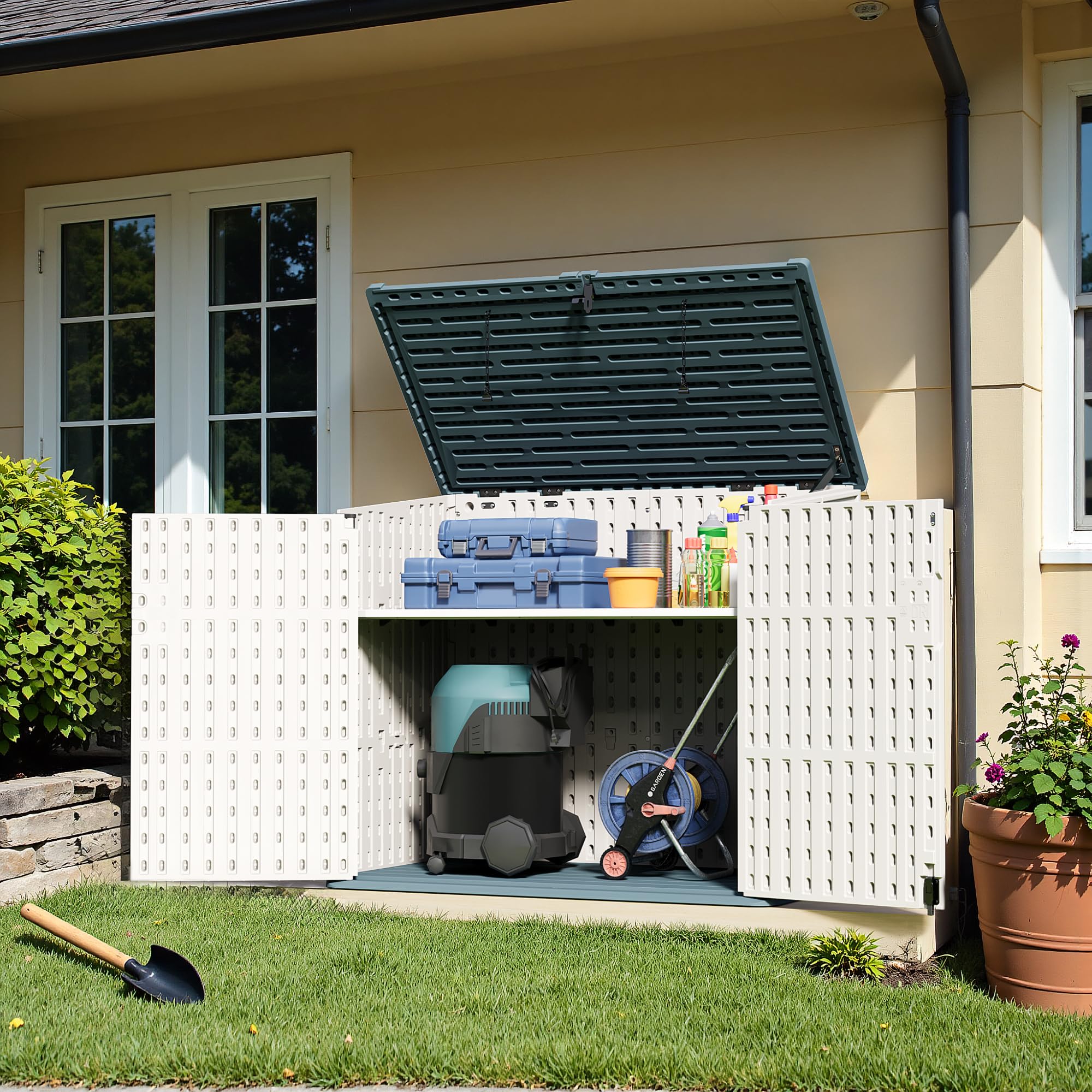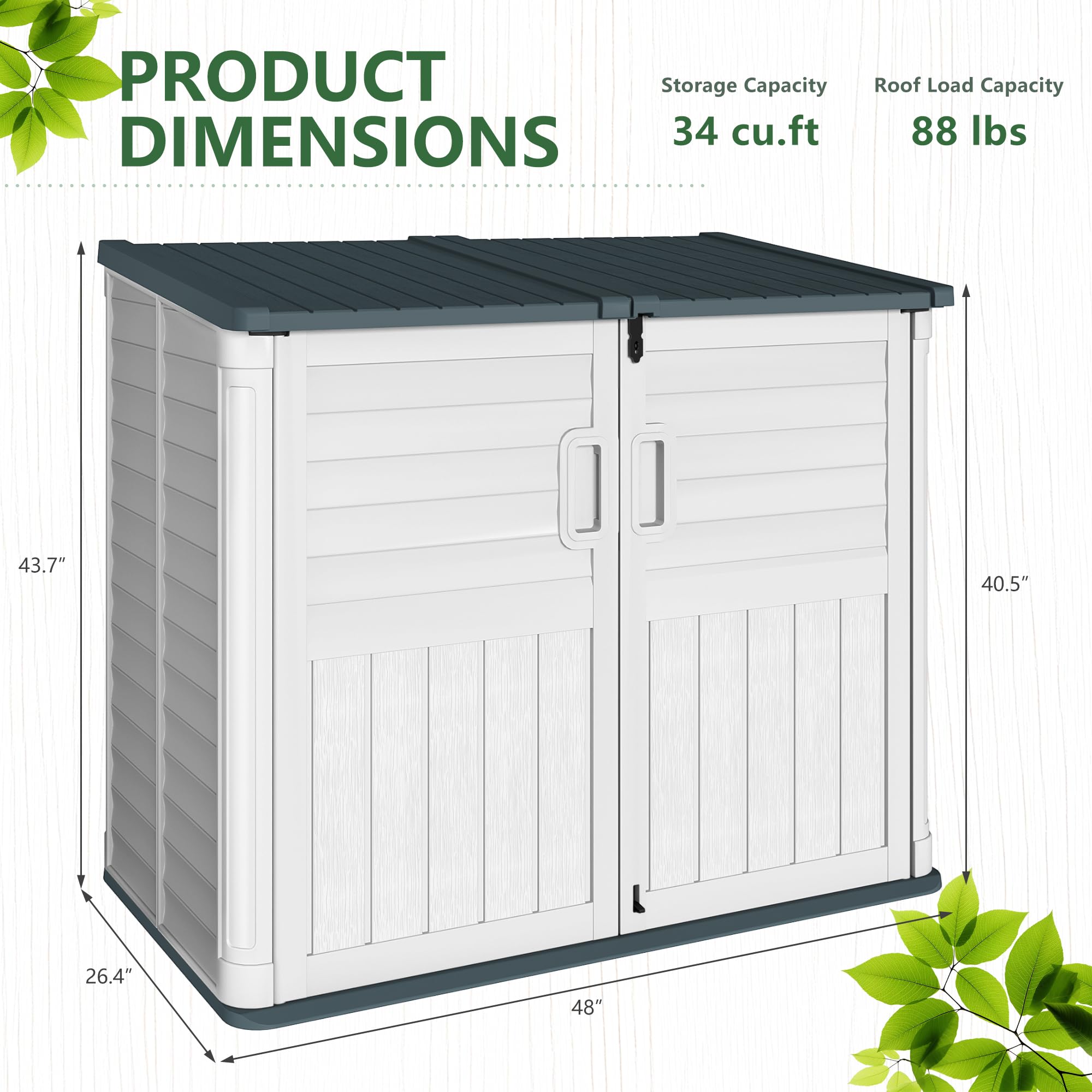 [Large Storage Capacity]: Greesum Outdoor Storage Dimensions: 49.6 in. L x 26.7 in. W x 42.9 in. H. Storage capacity: 34 cubic feet. Can store pool accessories, gardening tools, rubbish bins and other products to meet your daily needs. Product does not include shelves.