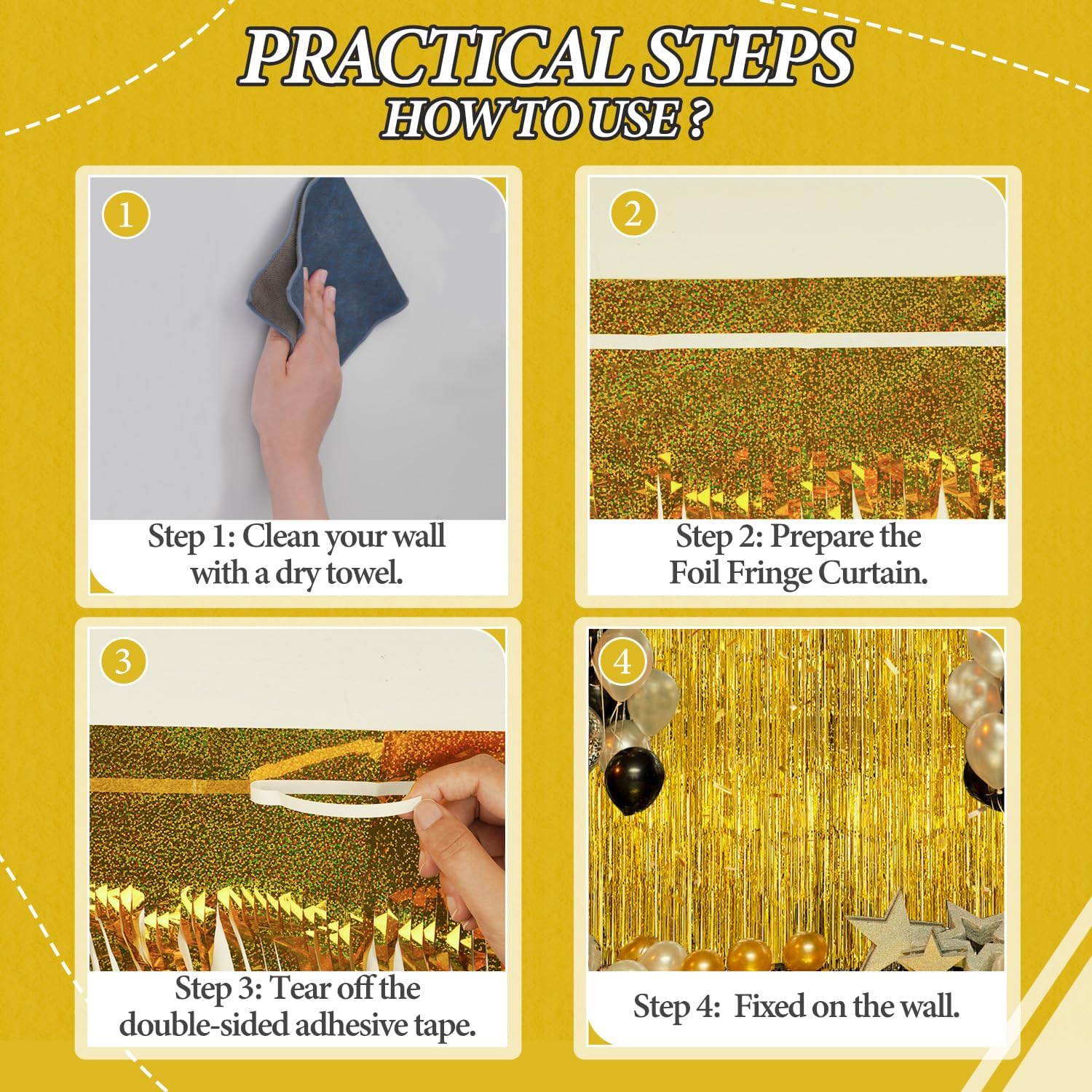 【Easy and Convenient Installation】These foil fringe curtains are easy to install and can be quickly hung on smooth surfaces using the included double-sided adhesive tape. No extra tools or materials required.