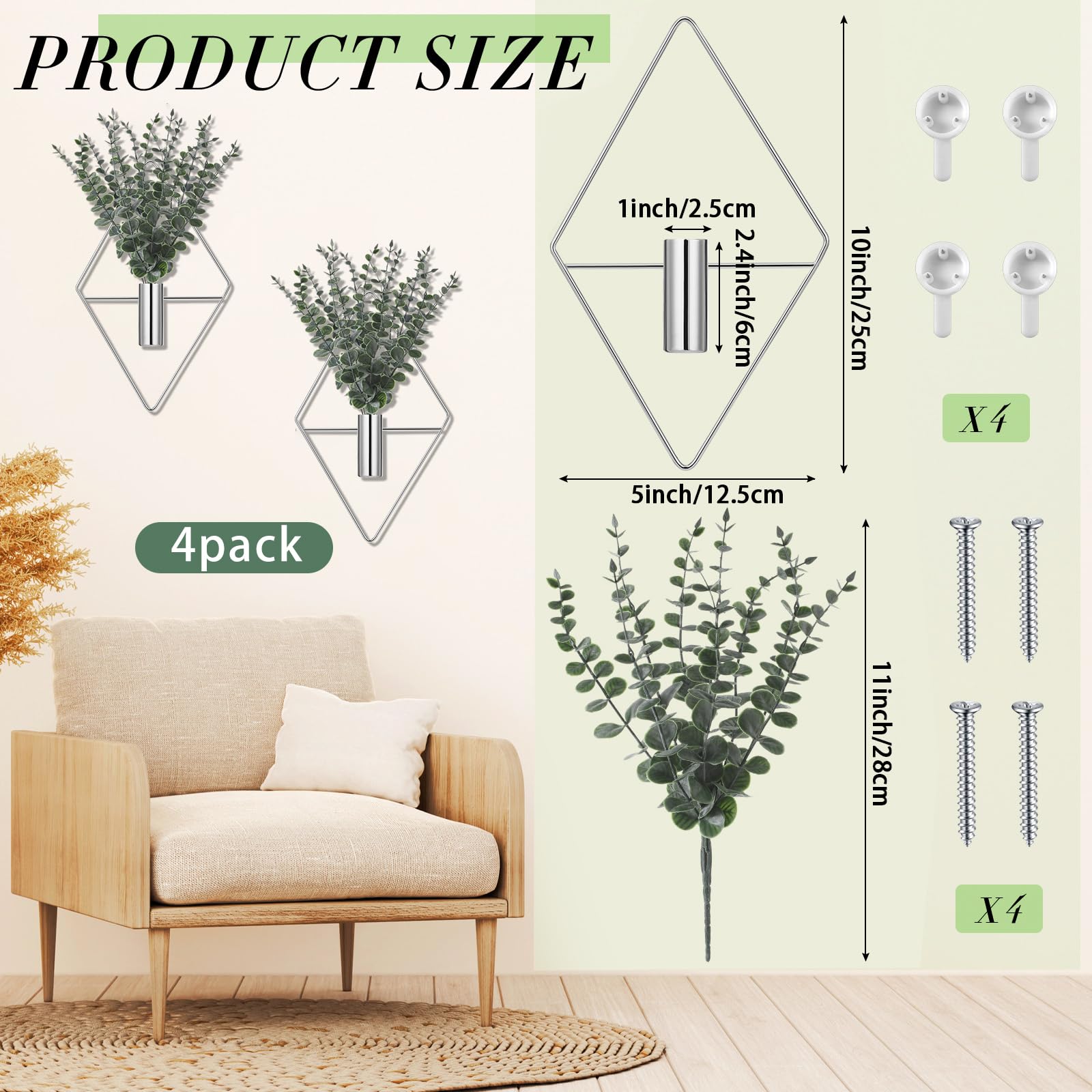 Detailed Sizes: each of the geometric wall planter for indoor plants measures approx. 25 x 12.5 cm/ 9.8 x 4.9 inches in whole size, and there is a 6 x 2.5 cm/ 2.4 x 1 inch inner tube in the center for holding artificial eucalyptus, faux flowers and plants, fake pearl strings, fresh flowers and more; The plant comes with the proper size