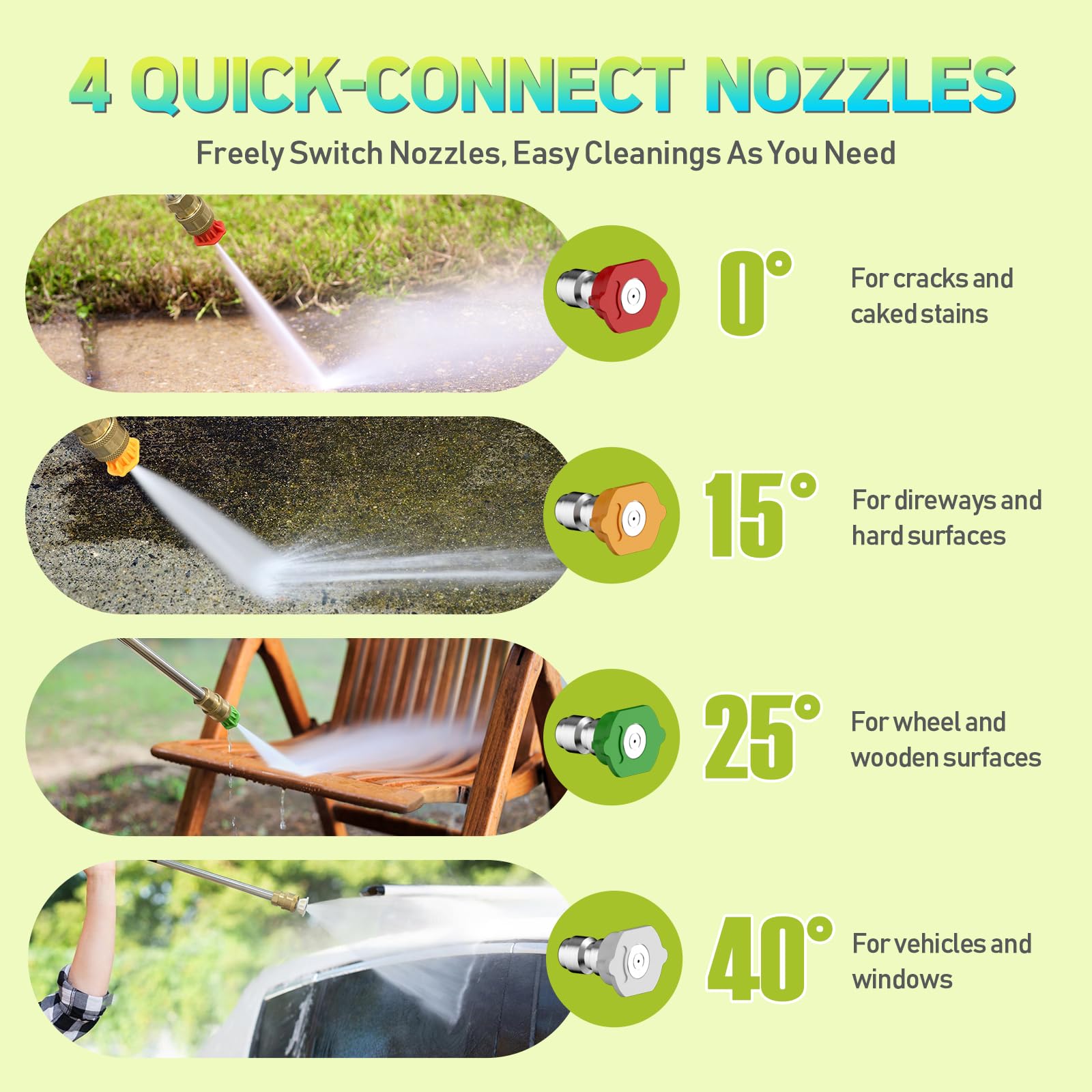 Accessories: 4 different nozzles (0 °, 15°, 25°, and 40°) and 500ml foam cannon meet your various requirements to complete any cleaning work