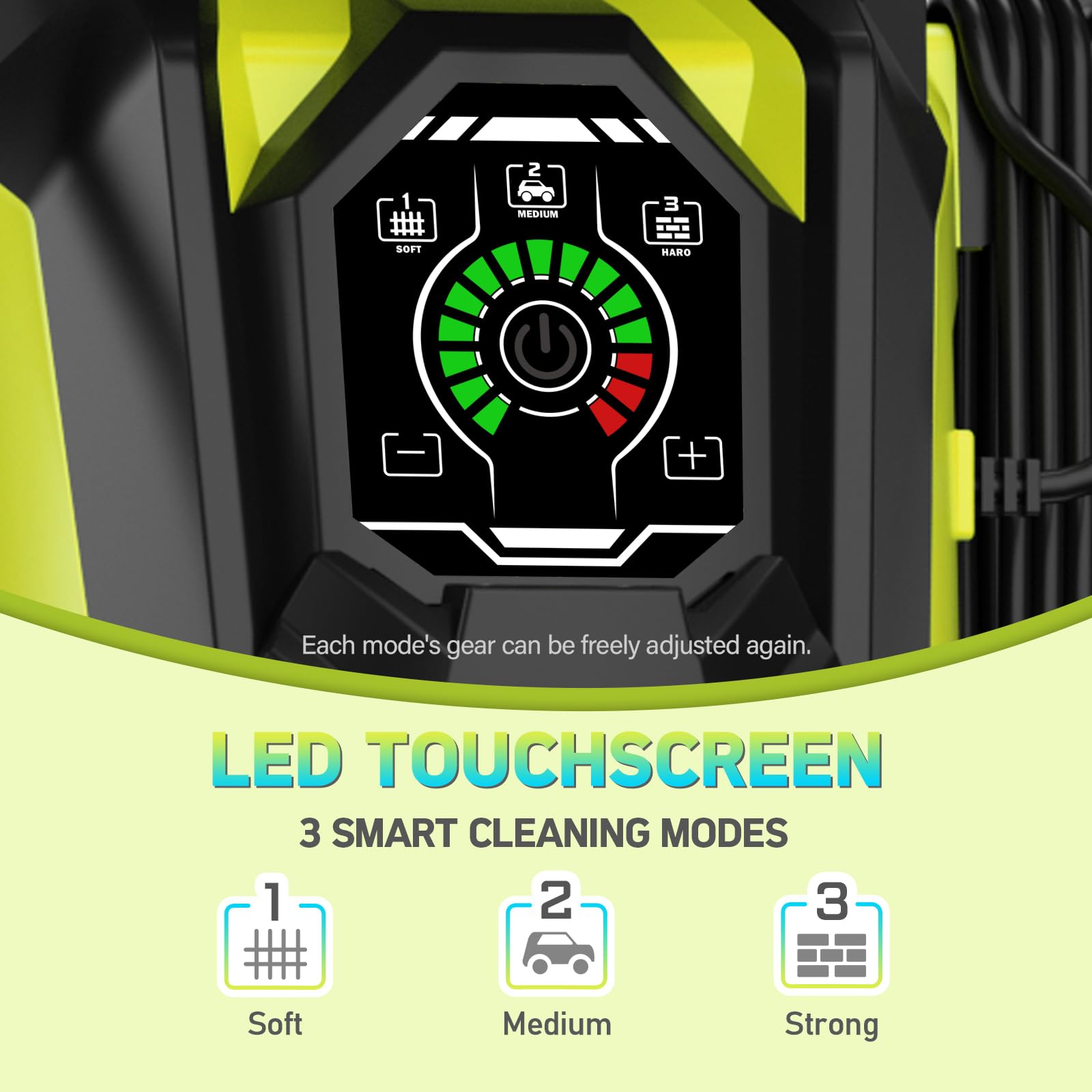 Softy Touch Screen: Our pressure washer provides three modes(Soft, Medium and Strong). Simply tap your finger to easily adjust the pressure you need, make cleaning a breeze
