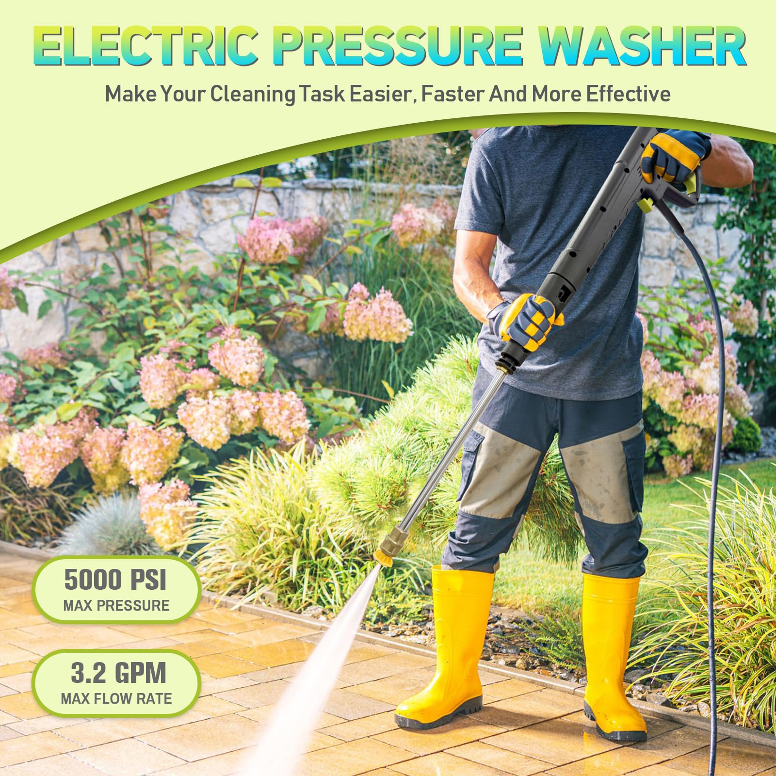 Free Your Hands: 5000PSIIMAX pressure help you quickly and easily to removing stubborn stains or dirts on cars, terraces, driveways, siding, fences and so on. 25ft long hose supports you to cleaning areas difficult to reach