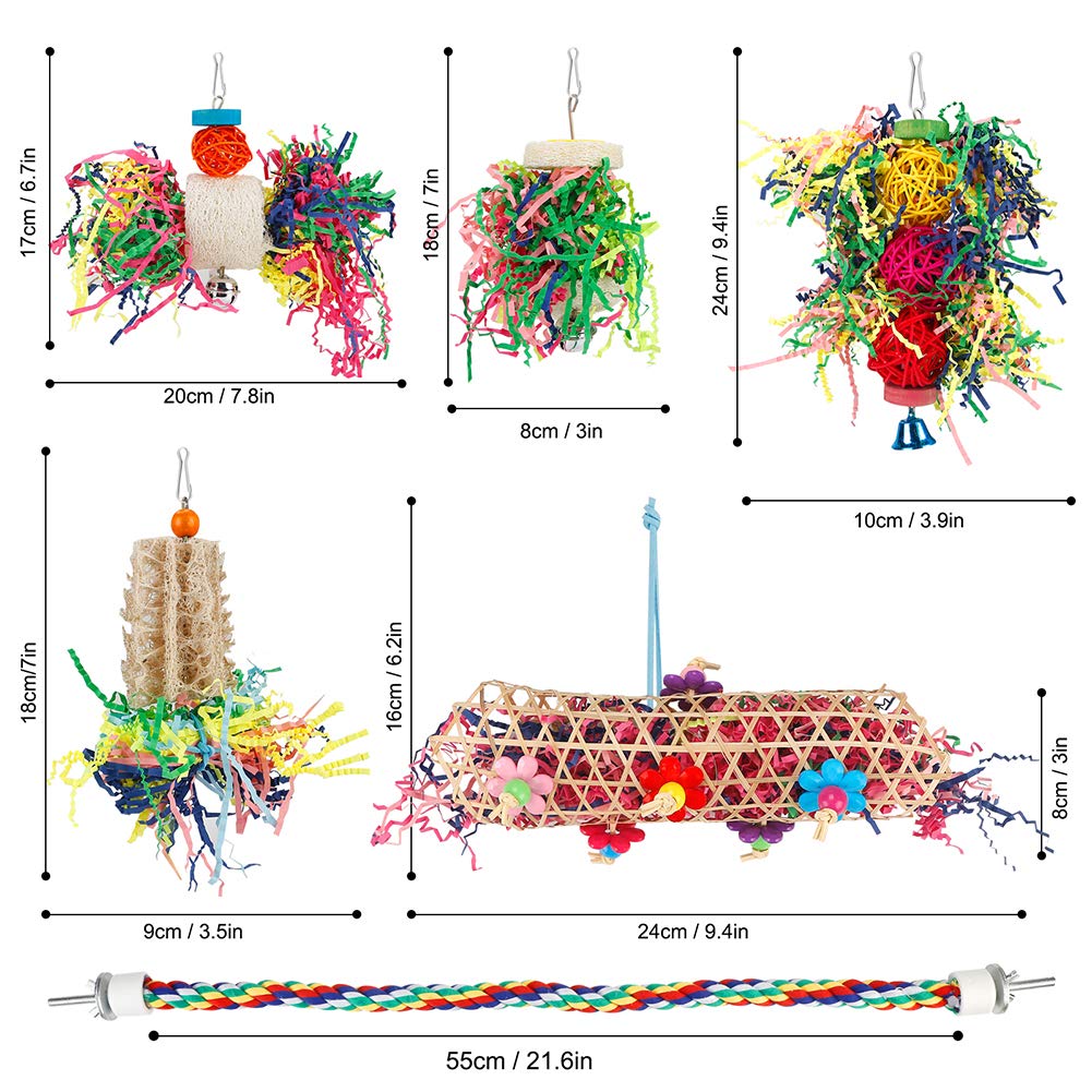 【Safe To Play】: These Parrot Cage Shredder toys are made of natural loofah, rattan balls,wood, stuffe with brightly colored crinkly papers which is very safe for your bird friends to chew. Hand-woven bird toys you can hide their treats in it which is an excellent selection for your pet friends who have a urge to chew and forage.