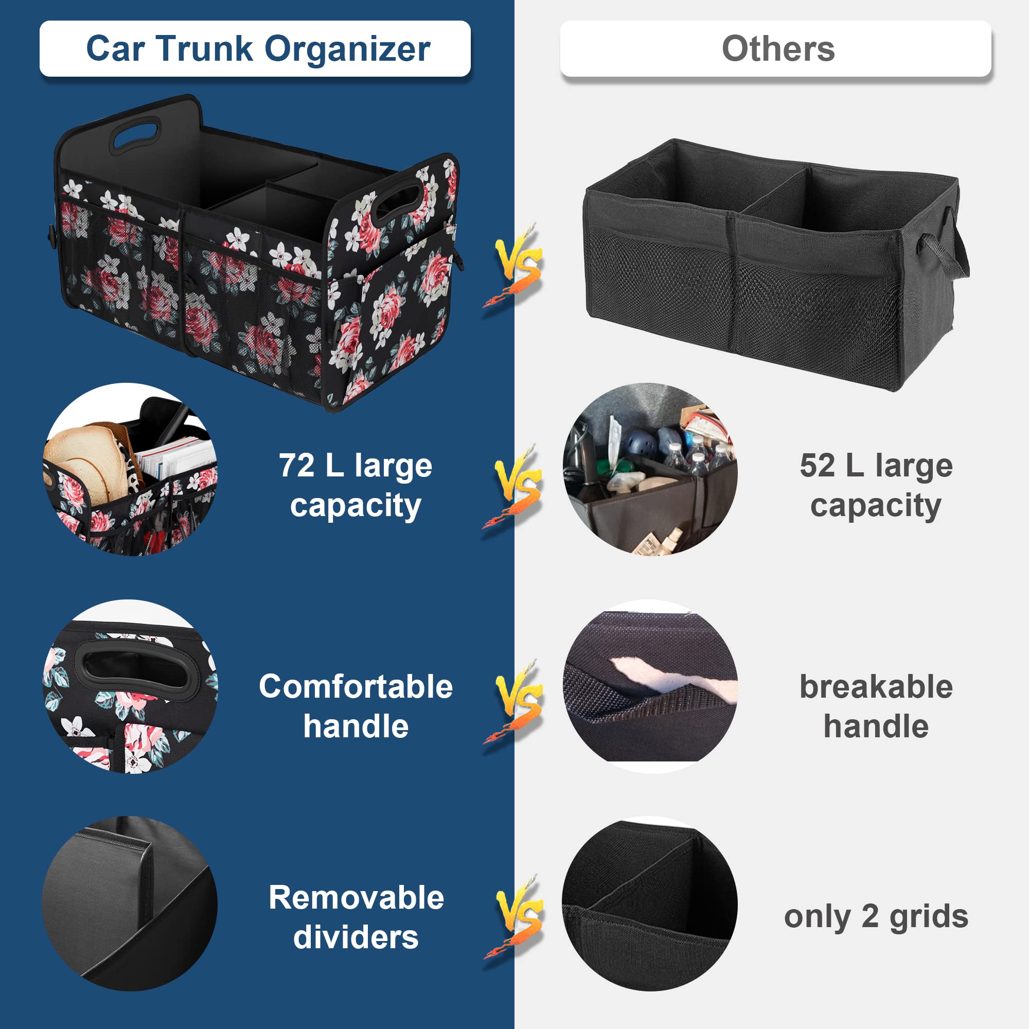【Large Capacity Trunk Organizer】:Upgrade the car trunk organzier capacity. Most of the car organizers in the market have a capacity of 50L-60L, but our trunk organizer has a capacity of 72L, which is 10L-20L more than similar trunk oganizers.