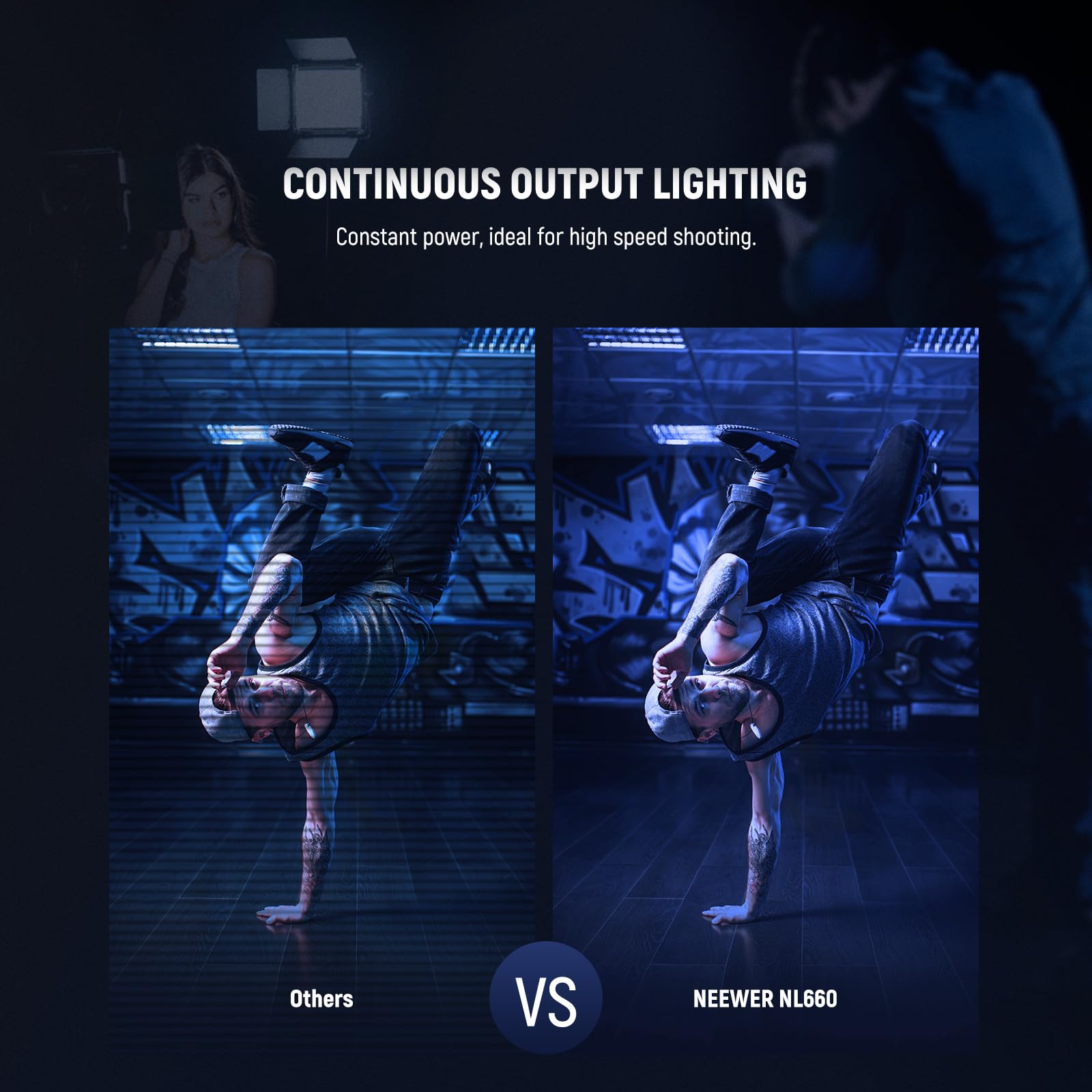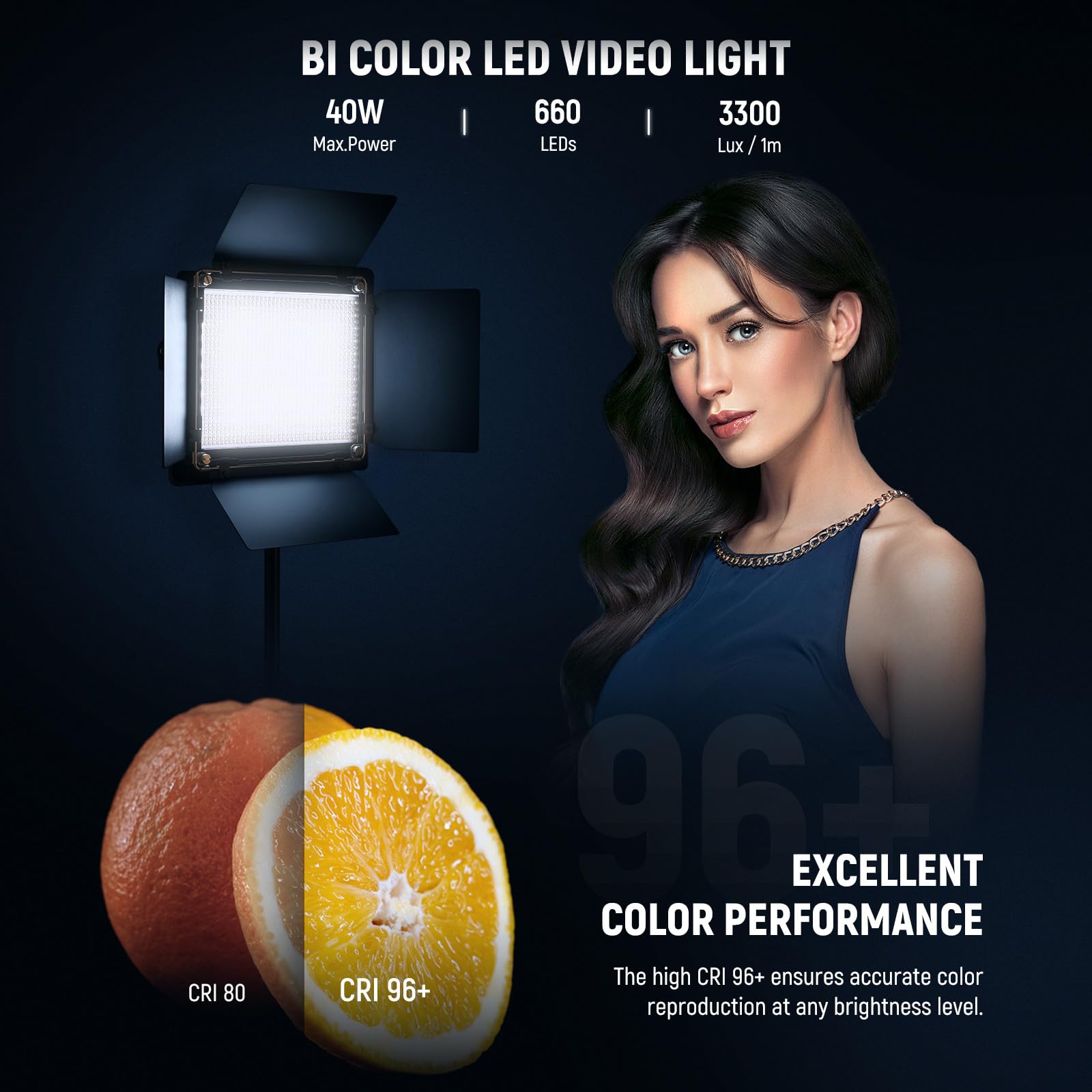 【Bi Color LED Video Light】 NEEWER NL660 features 330 warm white and 330 cool white LEDs that emit up to 3300lx/1m, offering ample brightness for professional studio photography. The 3200K-5600K enables seamless switching from 3200K Tungsten to 5600K Daylight, along with 0-100% dimming range, and CRI96+ for true to life color reproduction. Ideal key / soft fill lighting equipment for video podcasts, studio photoshoots, interviews, camera product photos, portrait, live streaming, barber, etc