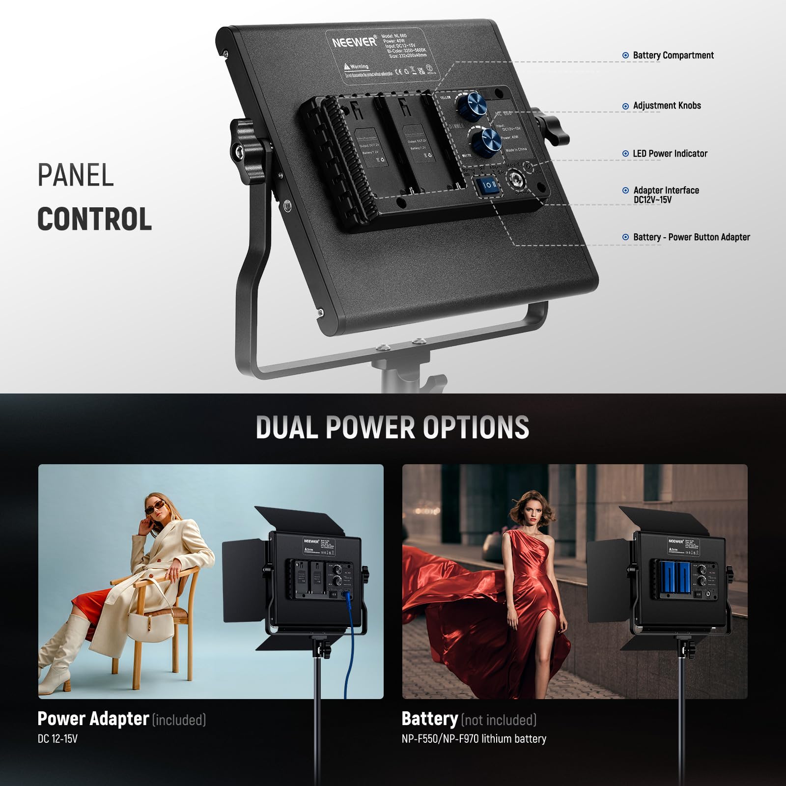 【Dual Power Options】 Power the film light indoors using the included AC power adapter and cable, or enjoy a cordless setup with an NP-F550 or NP-F970 Li-ion battery (not included) for outdoor shooting