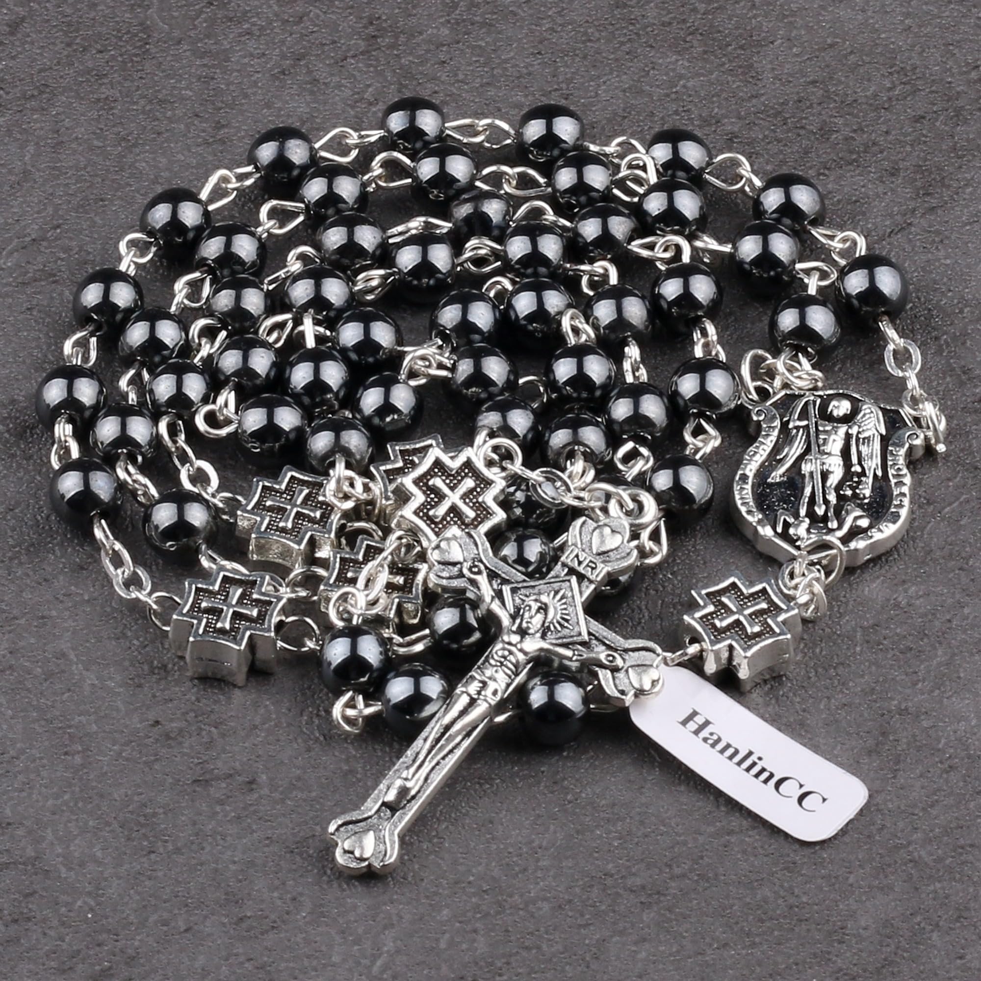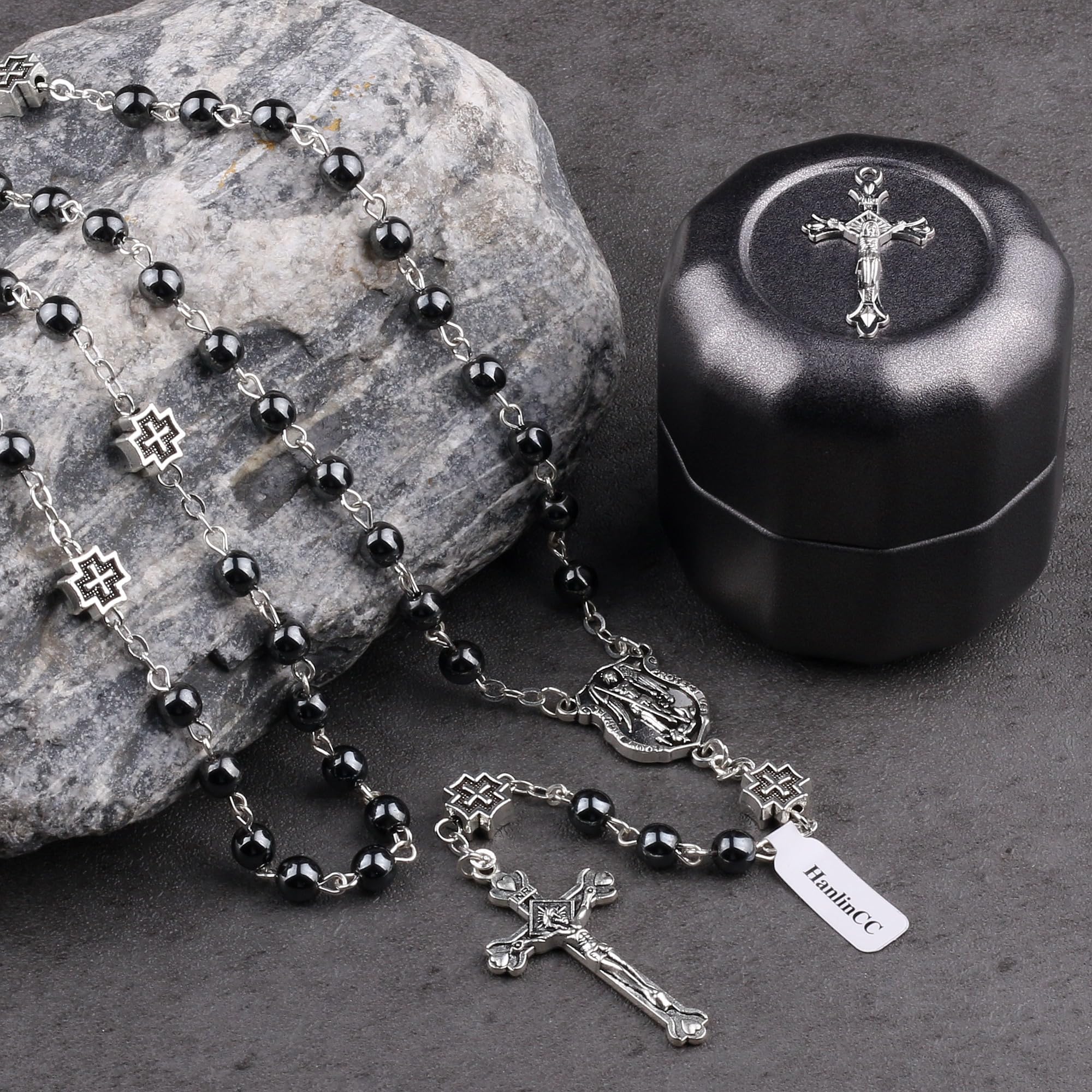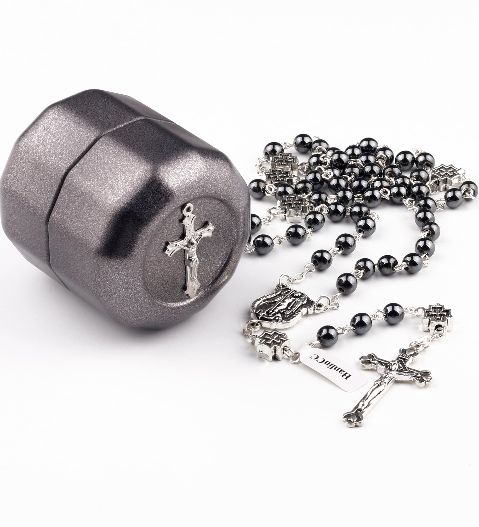 HanlinCC Hematite Stone Beads St.Michael Catholic Rosary Necklace,each rosary pack in gun black metal gift box, with a cross on the lid, the box looks beautiful and can protect rosary well inside; the box is small enough to put in pocket bring it to everywhere.