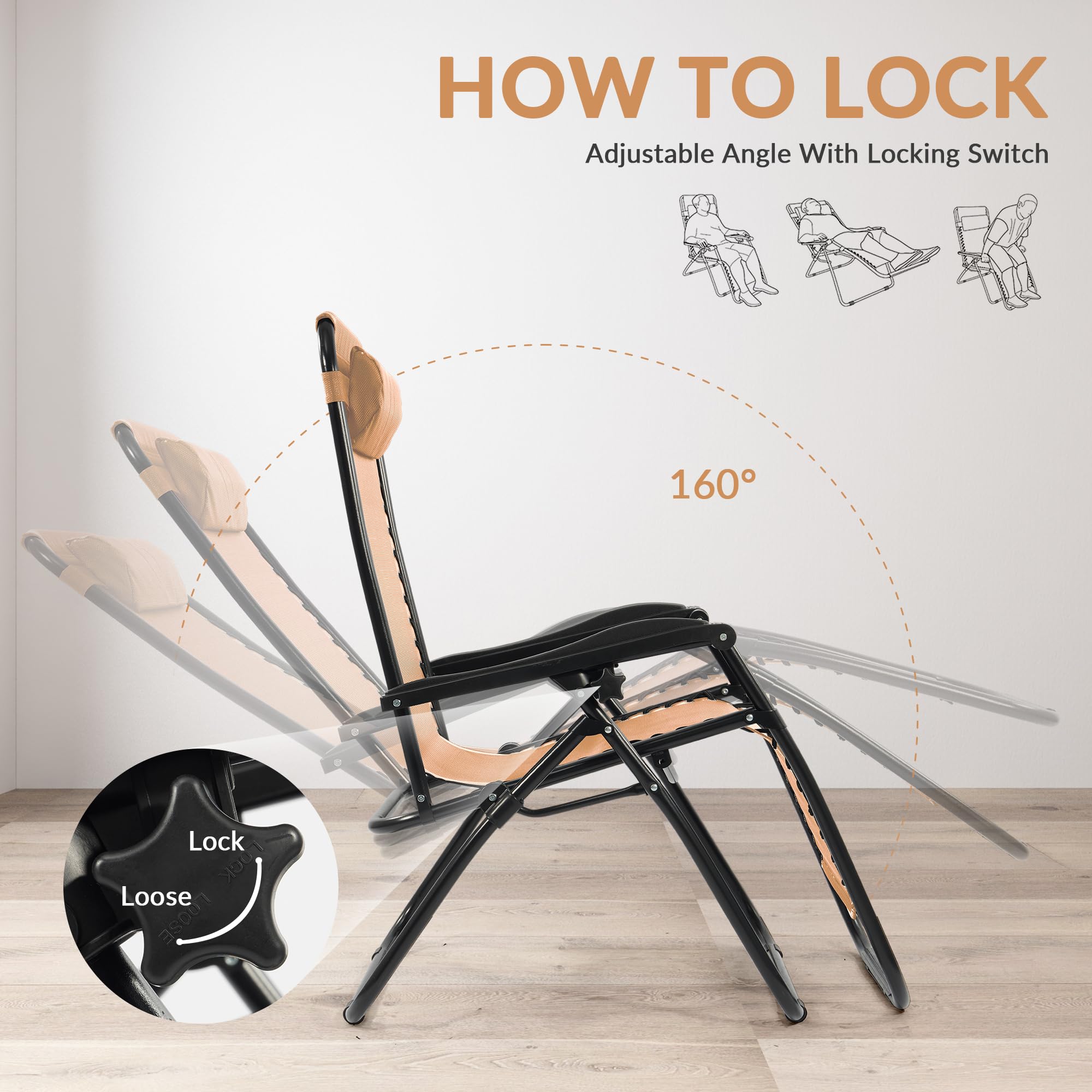 Experience the unparalleled comfort of our zero gravity chair, designed to provide an exceptional lounging experience With a weight capacity of 300 pounds, this chair effortlessly accommodates a wide range of body types. Design includes a knob for easy angle adjustment, allowing you to lock in your desired position effortlessly, whether you prefer sitting upright or fully reclining The removable headrest adds an extra layer of support, ensuring your neck and head are perfectly aligned for ultimate relaxation. Designed with your comfort in mind, our zero gravity folding chair includes built-in cup holders, allowing you to keep your favorite beverages within reach while you unwind. The sturdy elastic cords provide gentle support, conforming to your body’s contours for a truly relaxing experience. Ideal for use as camping chairs, patio chairs, or even beach chairs, this chair transforms your outdoor experience into a luxurious escape Measuring just 38" x 26.8" x 5.5" when collapsed, it easily fits into your car trunk or closet, making it an excellent choice for camping trips, beach outings, or backyard gatherings Constructed with high-quality materials, our zero gravity chair features a robust powder-coated steel frame, making it perfect for outdoor use. The fabric is not only weather-resistant but also breathable, ensuring comfort in both hot and cool climates. Cleanup is a breeze—simply wipe down the surface or hose it off for a quick refresh. This means you can spend less time fussing with your portable chair and more time enjoying your outdoor leisure activities Our zero gravity lounge chair is perfect for various settings and events. Whether you’re lounging by the pool, hosting a barbecue, or enjoying a quiet evening under the stars, this patio deals chair fits seamlessly into any environment. Perfect as outdoor chairs, these recliners are not just functional but also elevate your leisure time, whether you’re reading a book, catching up with friends, or simply soaking in the sunshine