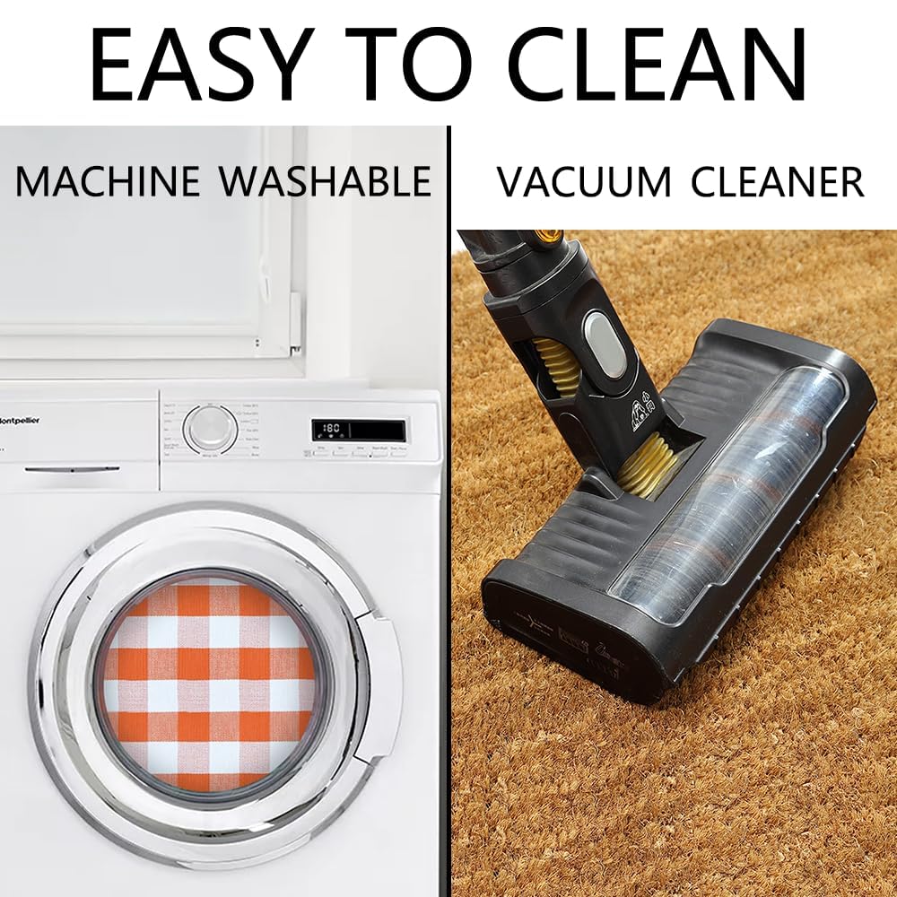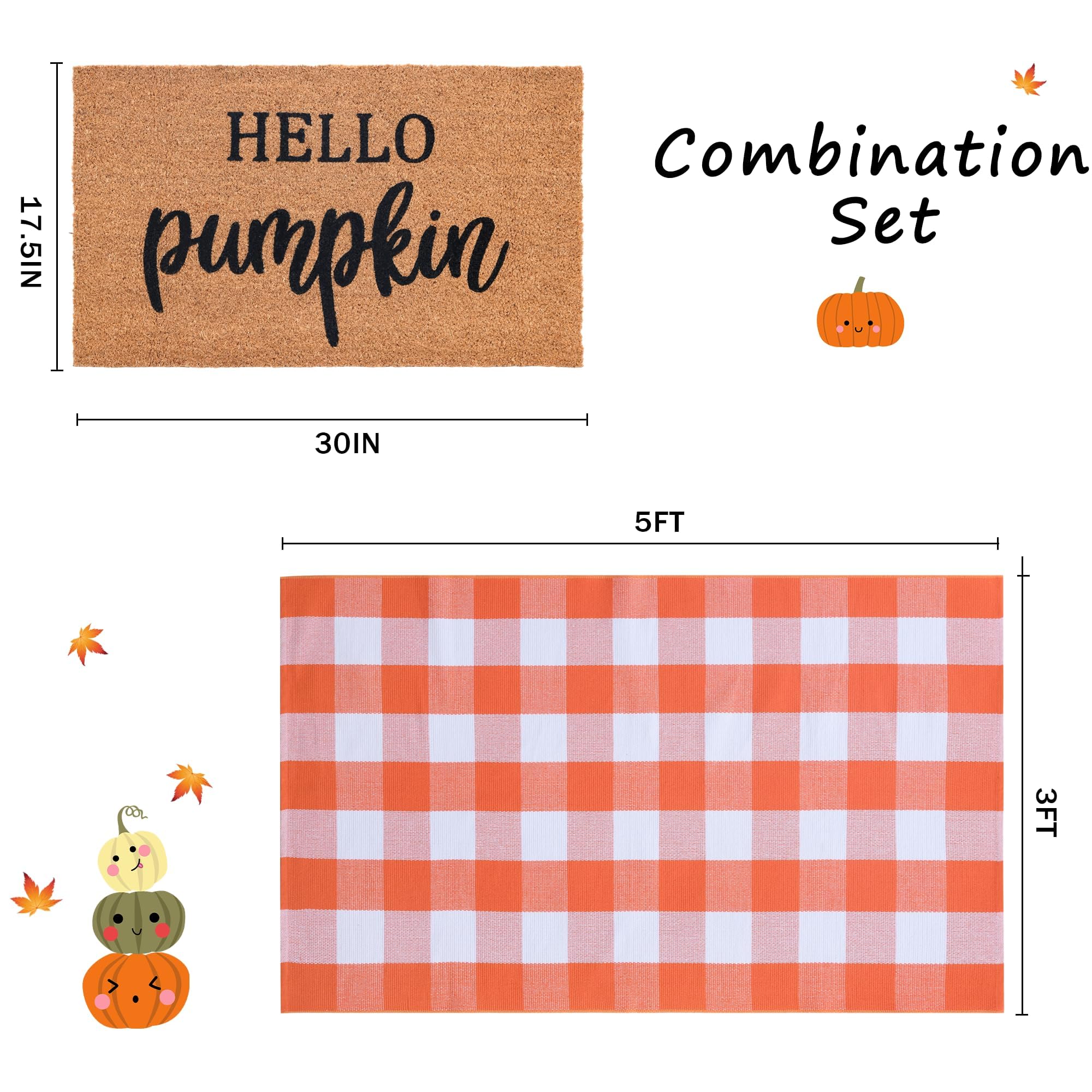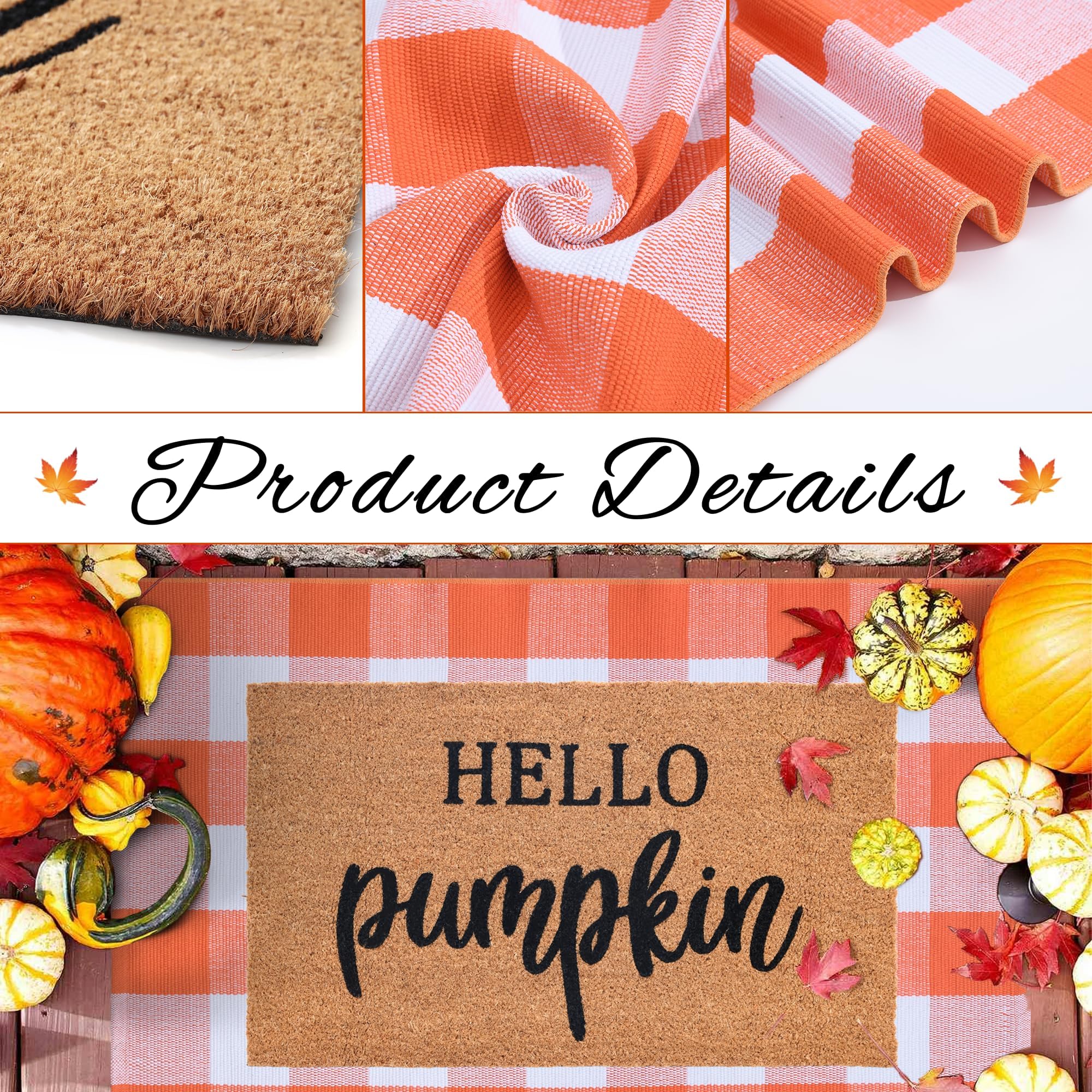 Enhance your home's style and functionality with our ideal decor set; It includes a 100% coco coir welcome mat and orange white plaid outdoor rug, perfect for upgrading your front porch; Elevate your fall front porch with these versatile door mats