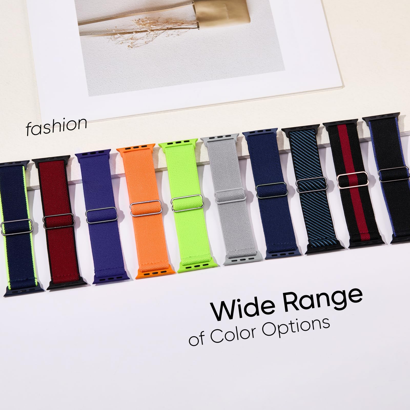 Butifacion 10 Pack Stretchy Solo Loop Compatible with Apple Watch Band 40mm 38mm 41mm 42mm 44mm 45mm 49mm Elastic Material These stretchy apple watch bands for women and men are made of premium stretch nylon material, soft, durable, lightweight, washable, stretchable and comfortable to wear. Ideal apple watch accessories for workouts and daily wear Adjustable Size Stainless steel buckle allows you to adjust the length of apple watch wristbands to fit almost any wrist size, ensuring a comfortable wearing experience. Stretchable but tight enough to stay on hands, no worries for iWatch falling off Ease of Use Easy to put on and take off. This apple watch series 9 band comes with watch lugs on both ends that lock onto your smartwatch interface precisely and securely. The band is easy to install and remove without any tools