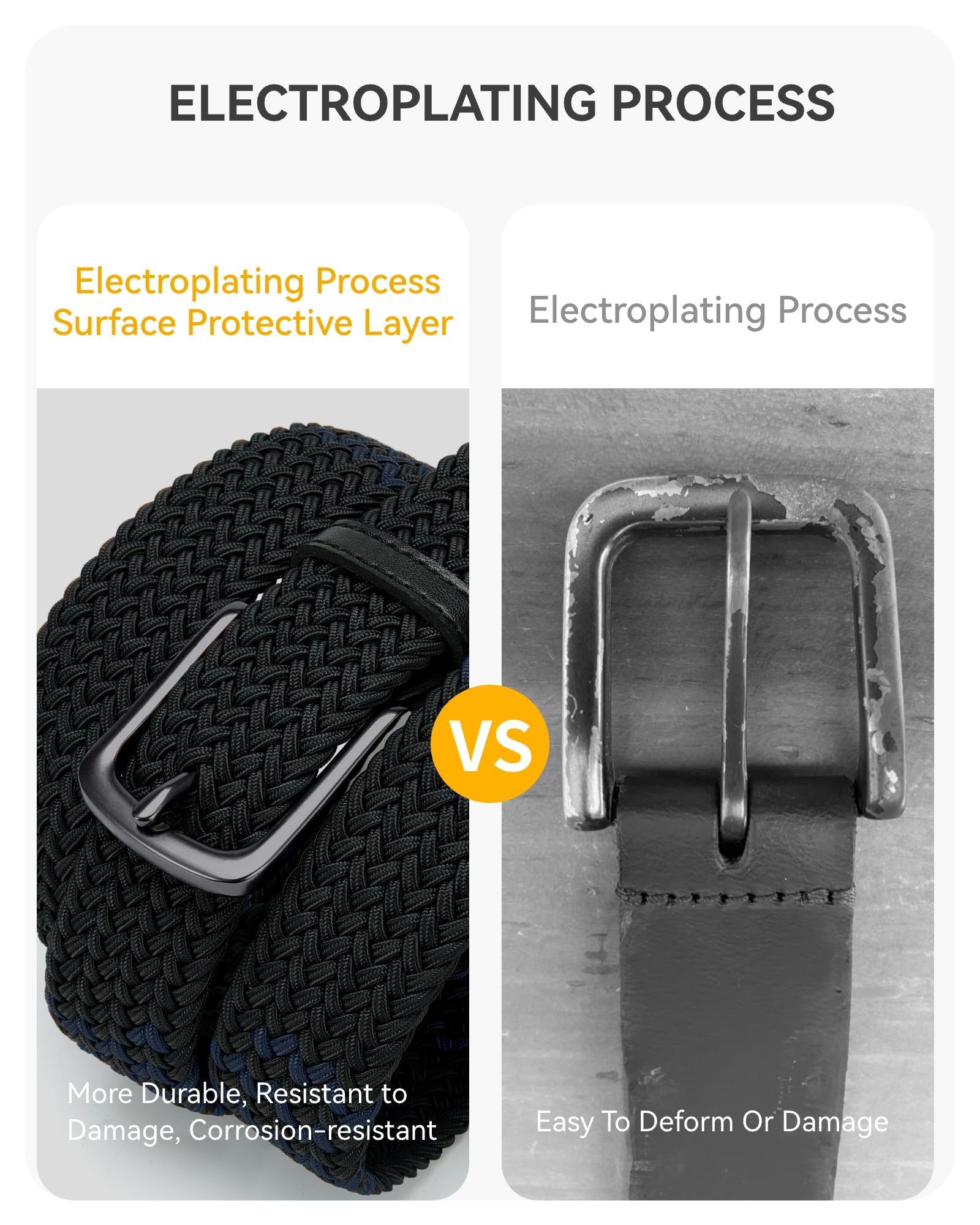 𝐑𝐞𝐢𝐧𝐟𝐨𝐫𝐜𝐞𝐝 𝐁𝐮𝐜𝐤𝐥𝐞: Embrace durability with our metal-reinforced design. Unbreakable and resistant to rust, the enhanced pin ensures longevity of the mens belts stretchable. No hole design provides breathability, also enables the buckle to lock in any position for perfect fit.