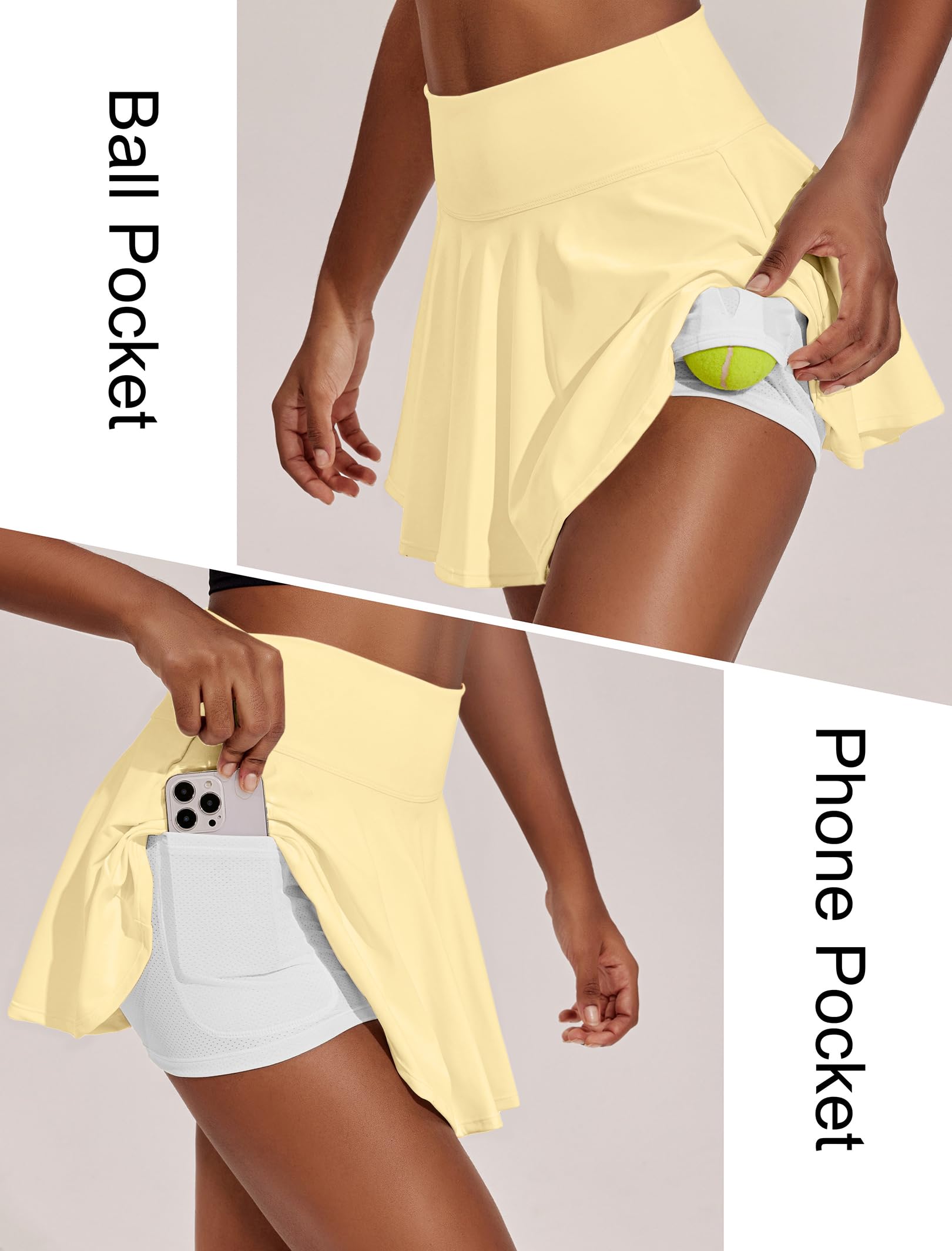 2 Pockets on Inner Shorts: The athletic skort features a built-in shorts liner with a left upside down pocket and a right phone pocket.