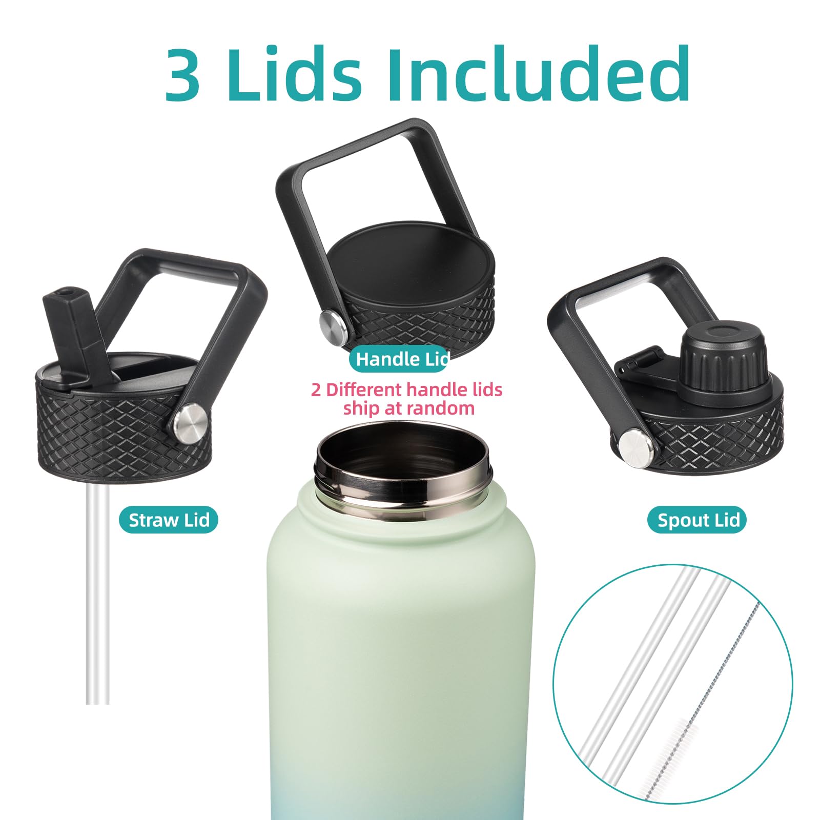The water bottle comes with 3 lids for different beverages, a sip lid for hot drinks, a straw lid for iced beverages, a flex-removable lid(2 different handle lids ship at random) for smoothies or fruit drinks. All lids are BPA-free, leak-proof, and dust-proof, catering to your needs