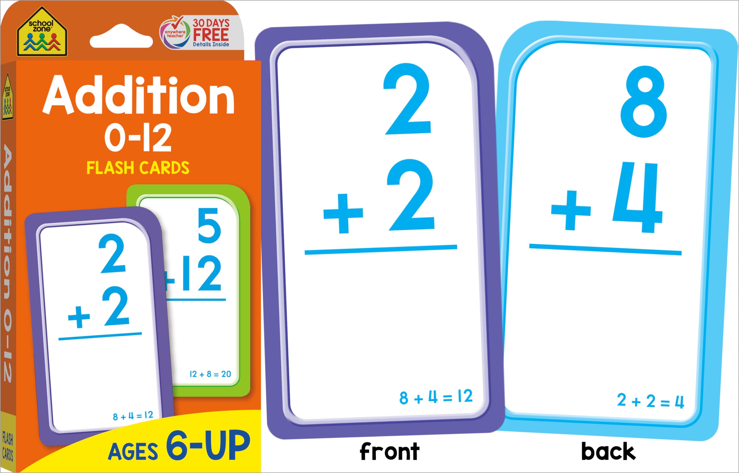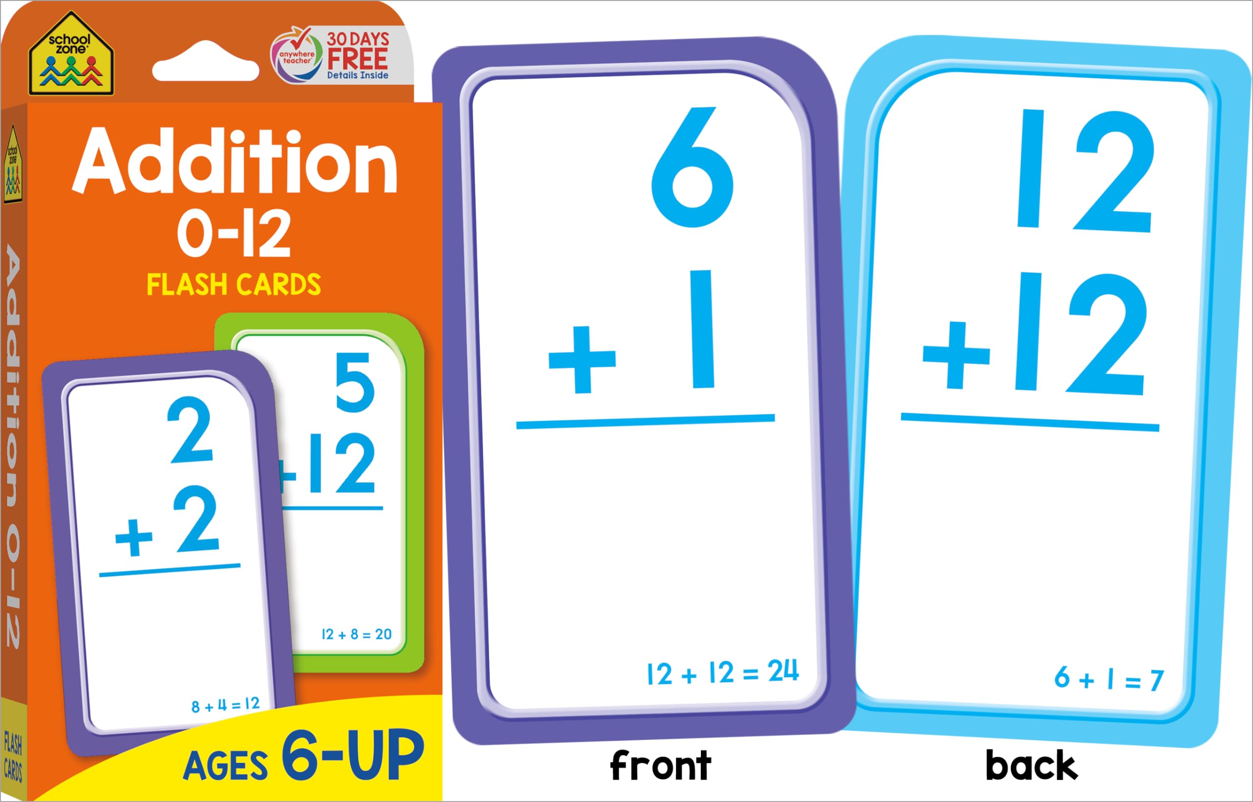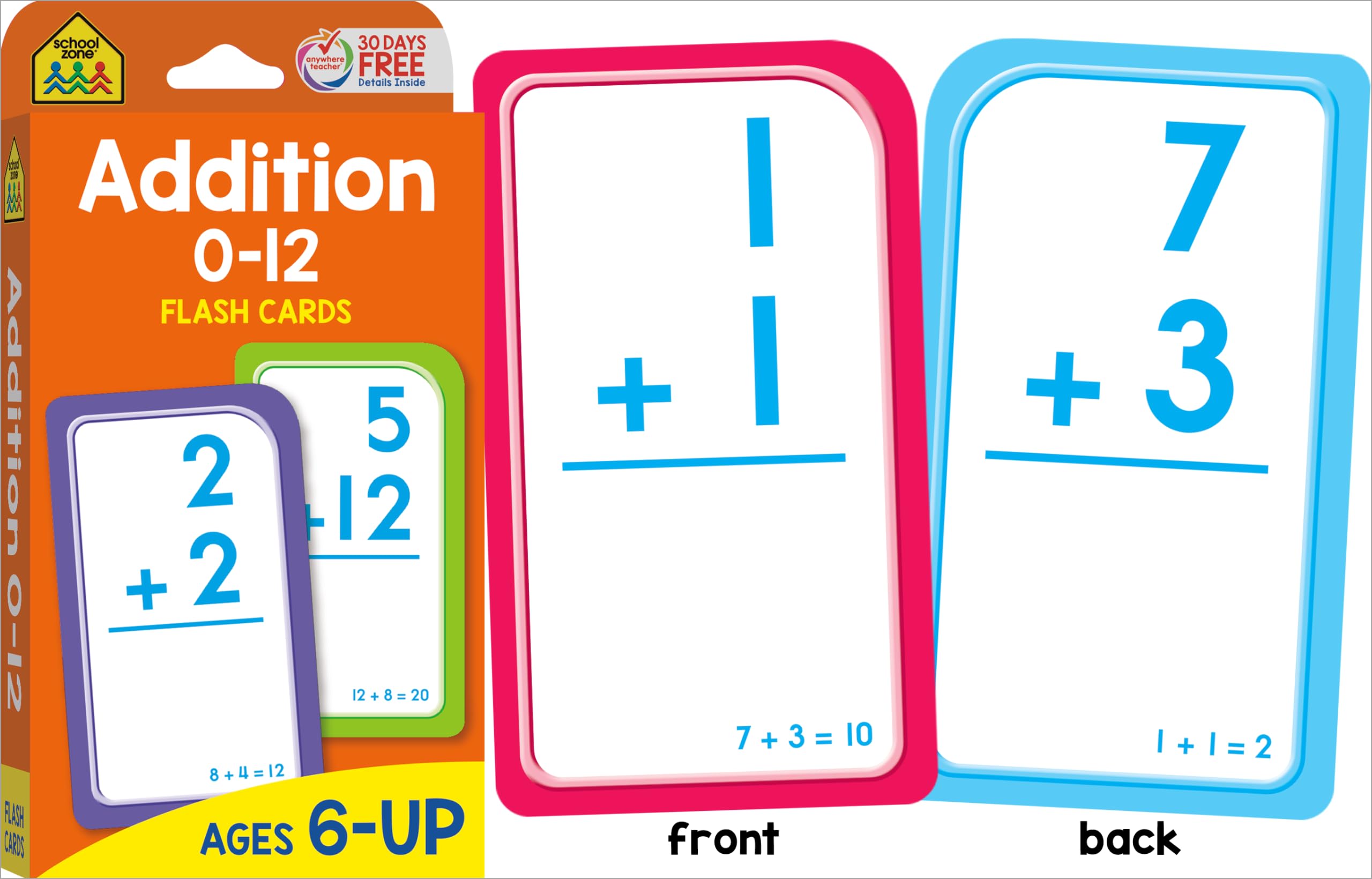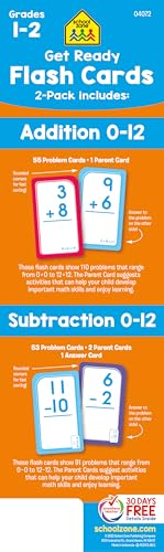 COMPREHENSIVE SKILL-BUILDING: Help first and second graders build a solid math foundation! Addition 0-12 Flash Cards show 110 problems that range from 0+0 to 12+12; Subtraction Flash Cards include 91 problems. First graders can practice addition and subtraction facts for speed and accuracy. Second graders can review and reinforce those skills. MAKE LEARNING FUN: Bold, colorful flash cards make math feel more like play. Use them to self-test or heat up a little competitive action with friends and family. Playing together is a great way to learn verbal communication, cooperation, and patience. Do speed drills, play games, and change it up! PORTABLE & CONVENIENT: Large 3”x 5” double-sided cards have easy-to-sort rounded corners. Find the answer to each problem on the flipside of each card. This multi-set pack is great for home, classroom, or on-the-go learning! PACKAGE INCLUDES: (1) Addition 0-12 Flash Card Set (56 cards), (1) Subtraction 0-12 Flash Card Set (56 cards). Each set includes an assortment of game, answer, and parent cards. Set does not include all addition and subtraction fact combinations for integers ranging 0-12. DEVELOPED IN THE USA: School Zone learning materials have helped educate three generations of kids, creating lifelong learners, and it all takes place here in the USA. Digital content, flash cards, workbooks, readers, and games―all are crafted through a child's eyes with teacher guidance and parent approval.