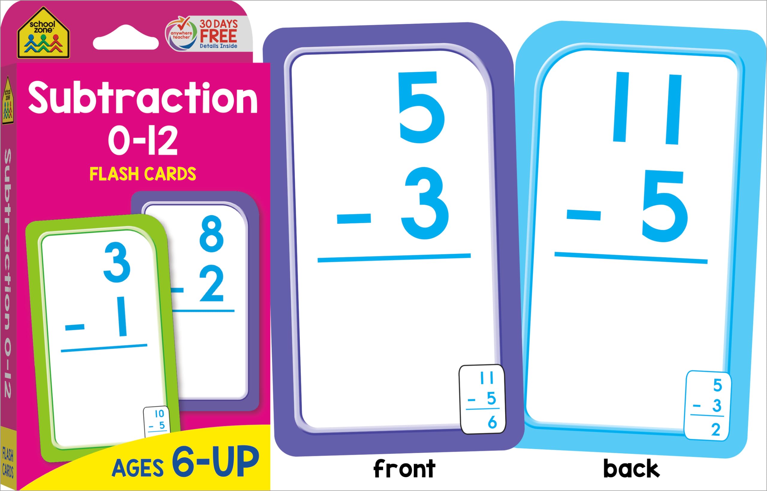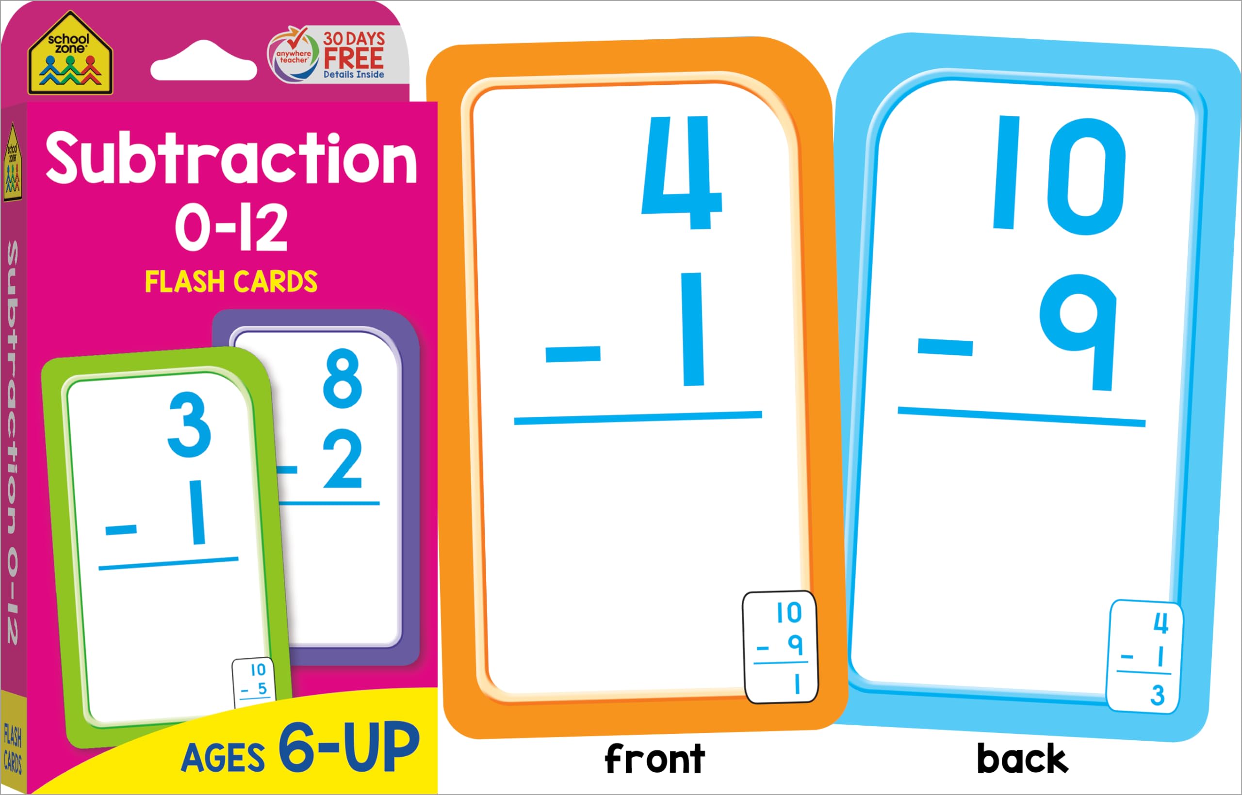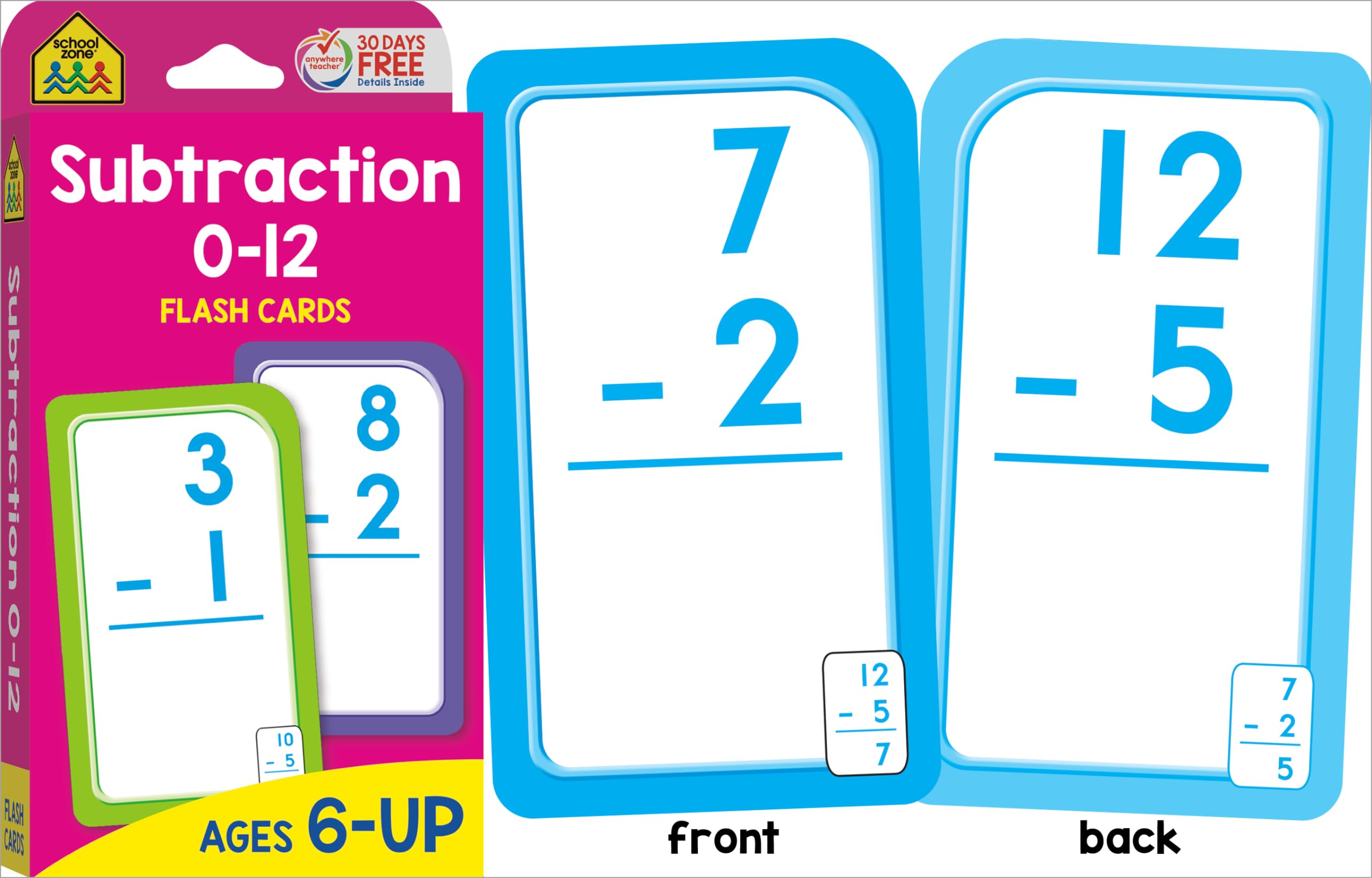 COMPREHENSIVE SKILL-BUILDING: Help first and second graders build a solid math foundation! Addition 0-12 Flash Cards show 110 problems that range from 0+0 to 12+12; Subtraction Flash Cards include 91 problems. First graders can practice addition and subtraction facts for speed and accuracy. Second graders can review and reinforce those skills. MAKE LEARNING FUN: Bold, colorful flash cards make math feel more like play. Use them to self-test or heat up a little competitive action with friends and family. Playing together is a great way to learn verbal communication, cooperation, and patience. Do speed drills, play games, and change it up! PORTABLE & CONVENIENT: Large 3”x 5” double-sided cards have easy-to-sort rounded corners. Find the answer to each problem on the flipside of each card. This multi-set pack is great for home, classroom, or on-the-go learning! PACKAGE INCLUDES: (1) Addition 0-12 Flash Card Set (56 cards), (1) Subtraction 0-12 Flash Card Set (56 cards). Each set includes an assortment of game, answer, and parent cards. Set does not include all addition and subtraction fact combinations for integers ranging 0-12. DEVELOPED IN THE USA: School Zone learning materials have helped educate three generations of kids, creating lifelong learners, and it all takes place here in the USA. Digital content, flash cards, workbooks, readers, and games―all are crafted through a child's eyes with teacher guidance and parent approval.