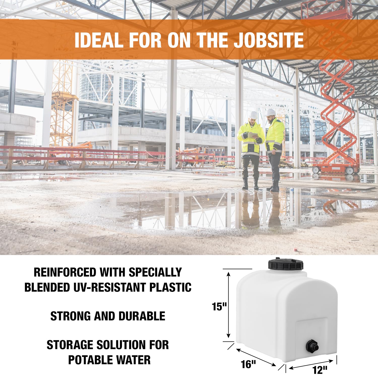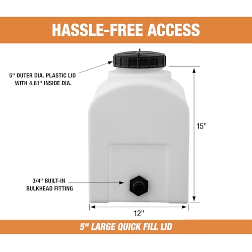 Wide fill cap and built-in drain allow for fast, controlled filling and emptying; includes bulkhead fitting for convenient siphoning or hose connection in the field