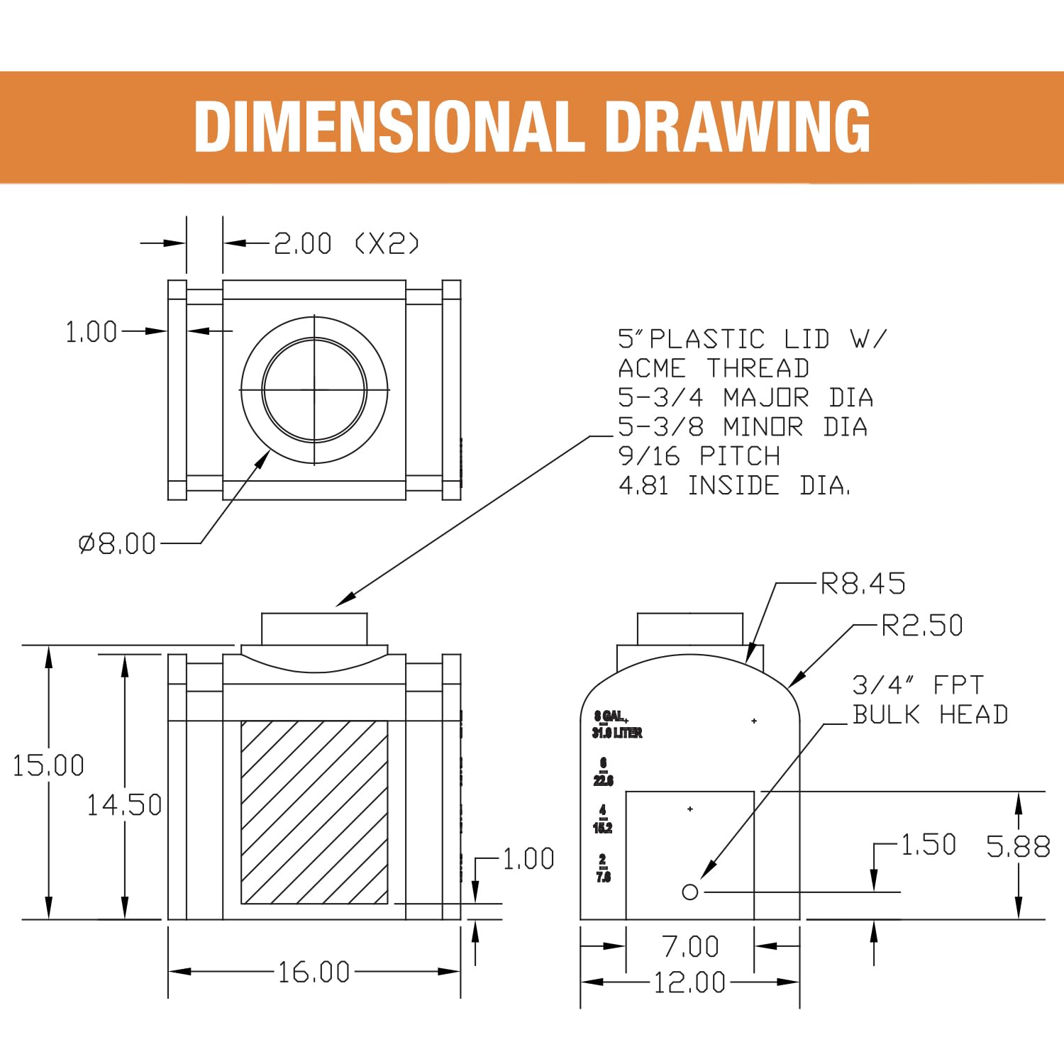8 gallon capacity with 5-1/2" lid (5" diameter hole), 3/4" NPT outlet for water and other non-flammable liquids