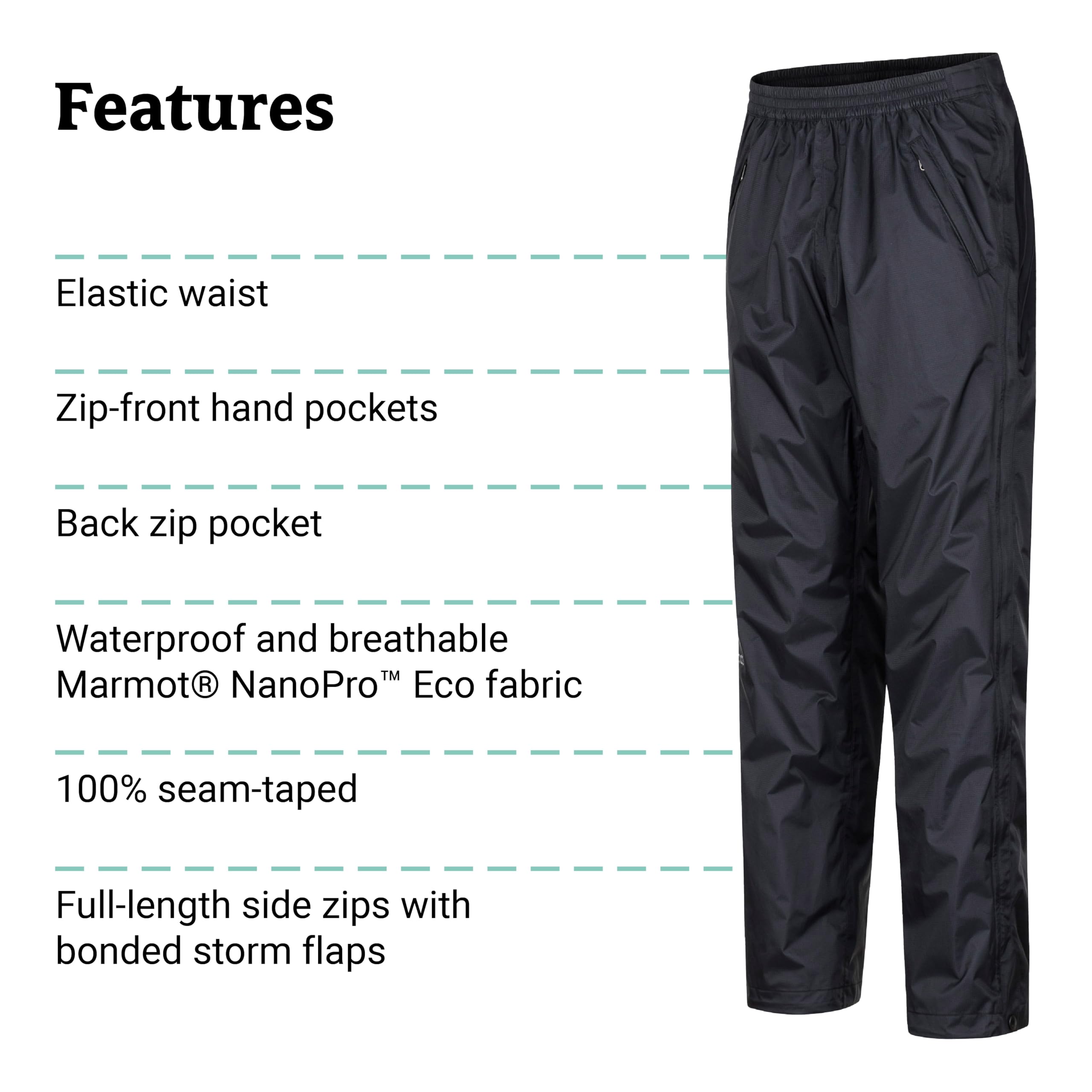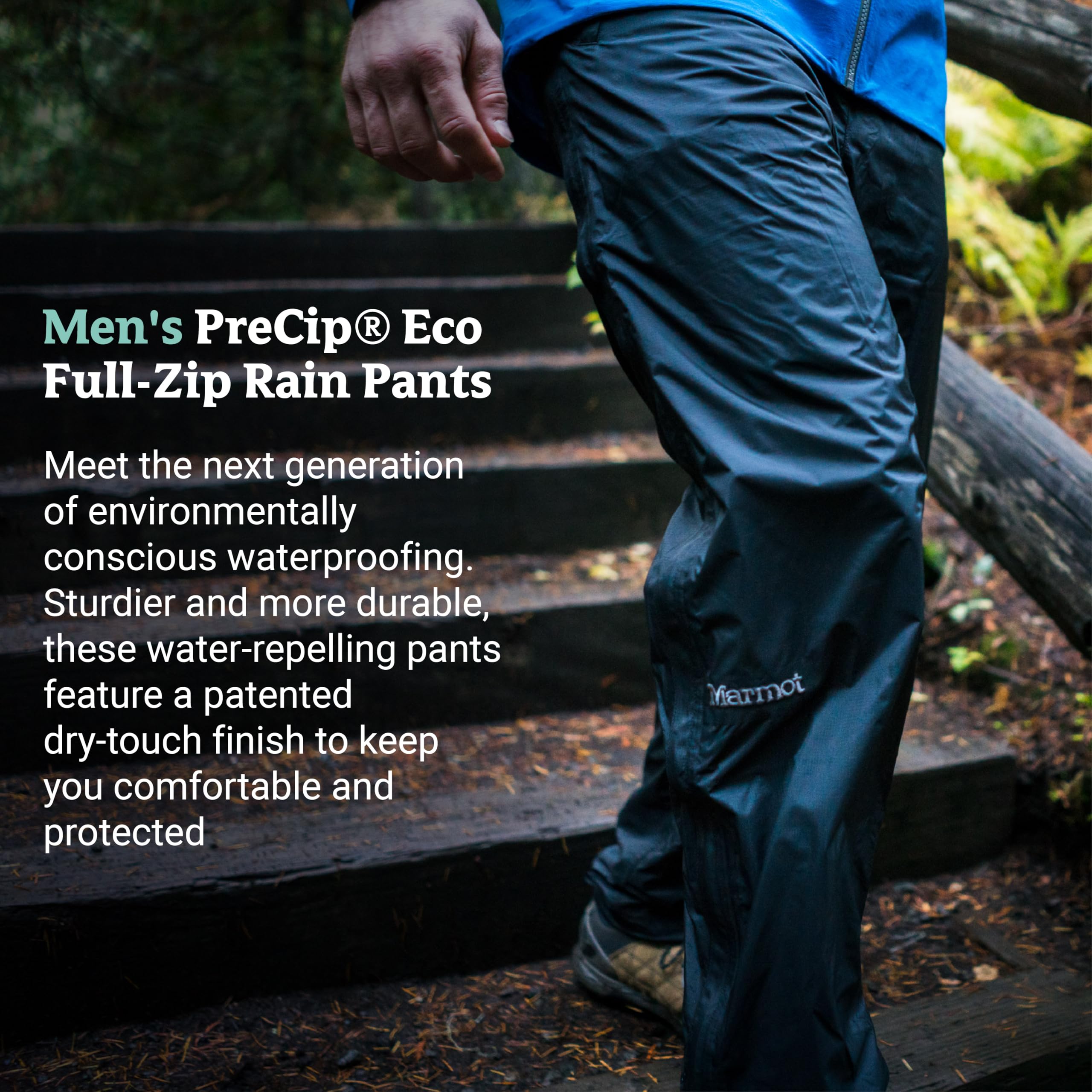 Description Meet the environmentally conscious and high-performing next generation of waterproofing: the lightweight PreCip Eco Full Zip Pant. The waterproof/breathable, PFC-free Marmot NanoPro™ recycled nylon face fabric lasts longer, thanks to the advanced technology of our microporous coating. Sturdier and more durable and with a patented dry-touch finish, these water-repelling pants will keep you comfortable and protected during planned treks in stormy weather and as a just-in-case piece in your pack for unexpected downpours. These water-repelling pants also feature fully taped seams to prevent leaks, full-length side zippers to allow quick and easy layering, and bonded storm flaps over the zippers to keep moisture out. Zippered hand pockets and a zippered back pocket provide quick storage while the elastic waist gives you a secure yet comfortable fit.
