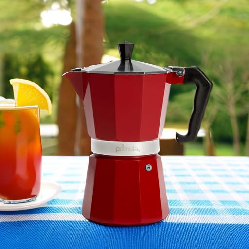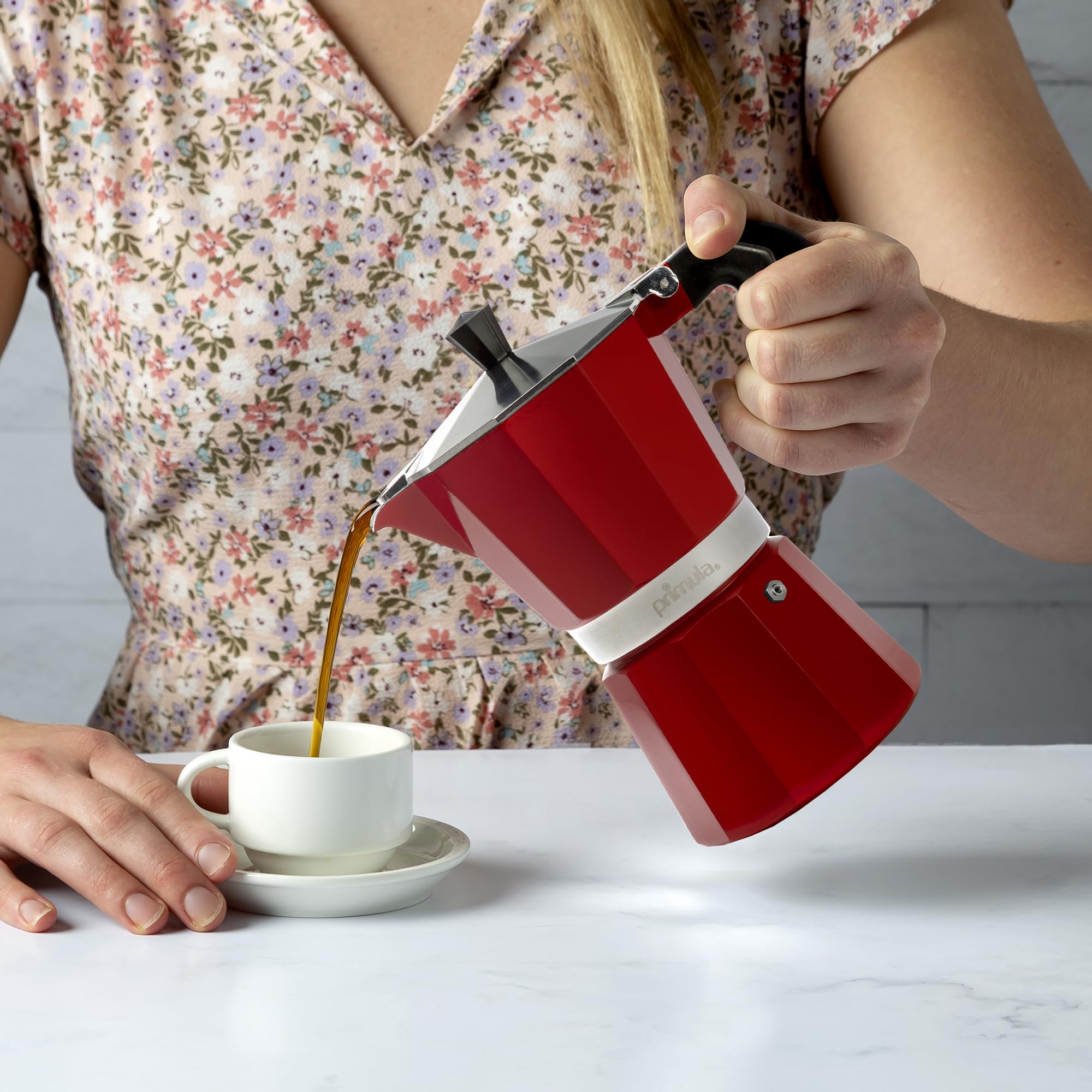 Be your own barista at home with Primula's Stovetop Espresso Coffee Maker. Save time and money when you craft your own espresso shot, Cuban coffee, Italian-style coffee, Moka, cappuccinos, Americano, lattes and more from the convenience of your home. This Moka pot delivers six perfect demitasse/espresso servings of rich, authentic espresso or Cuban coffee without the hassle of an electric espresso machine. It is carefully crafted with cast aluminum for long-lasting durability and even heat distribution for enhanced flavor, aroma and consistency. Also features a flip-top lid with heat-resistant knob and handle for safe, easy pouring and a safety-release valve which controls the pressure with which the water is delivered to the coffee grounds. To use, simply fill the lower chamber with water, fill the filter with ground coffee and place on stovetop. Within minutes, hot, delicious, bubbling espresso will fill the pot. PRO TIP: Make sure to position the handle away from the low/medium heat source. Remove from heat and enjoy! Clean up is just as easy. Rinse the components with water only and allow to fully dry before reassembling. This coffee maker is portable and works on all electric, ceramic and gas stovetops (including propane) making it the perfect camping accessory. Visit the Primula Brand Store for more award-winning coffee and tea must-haves!