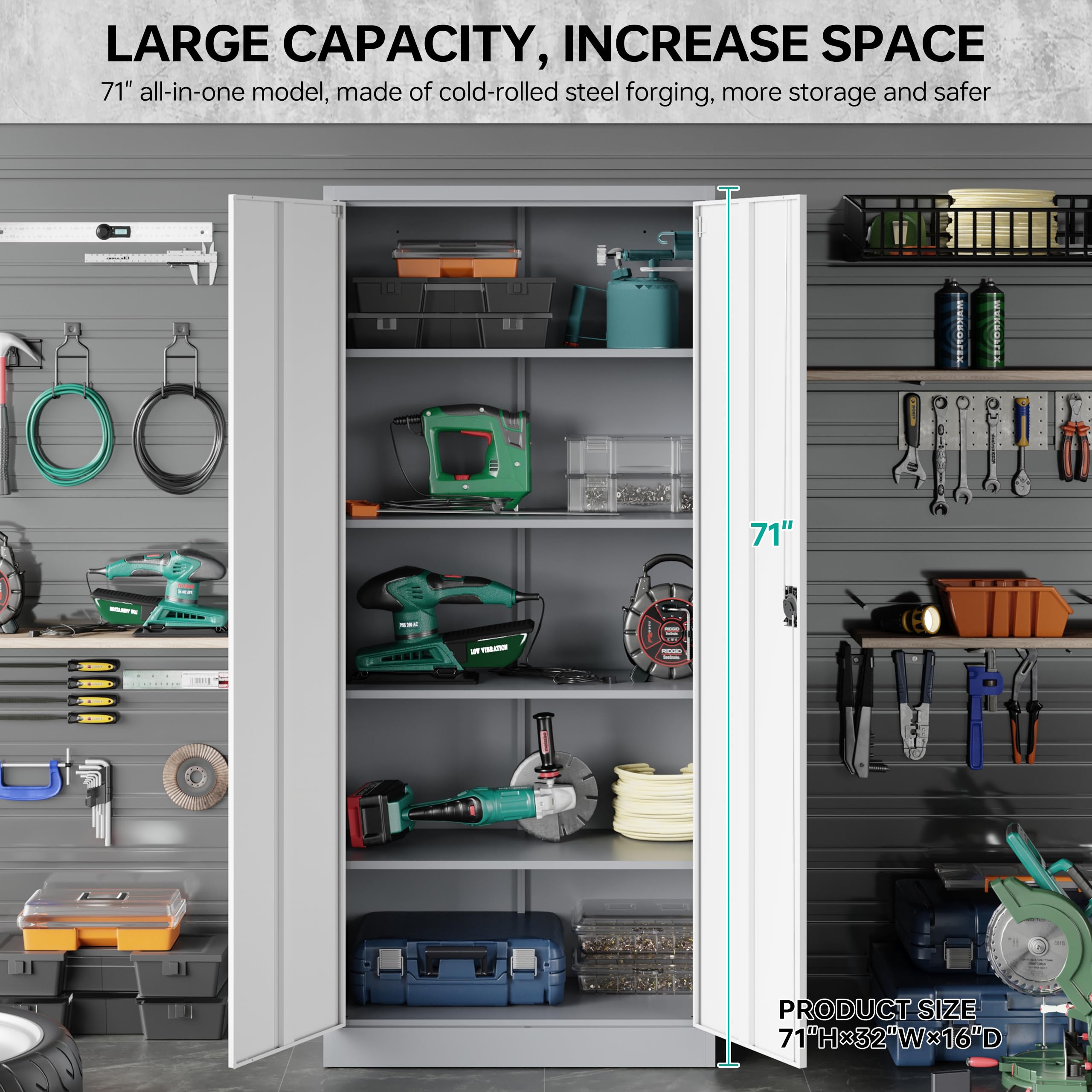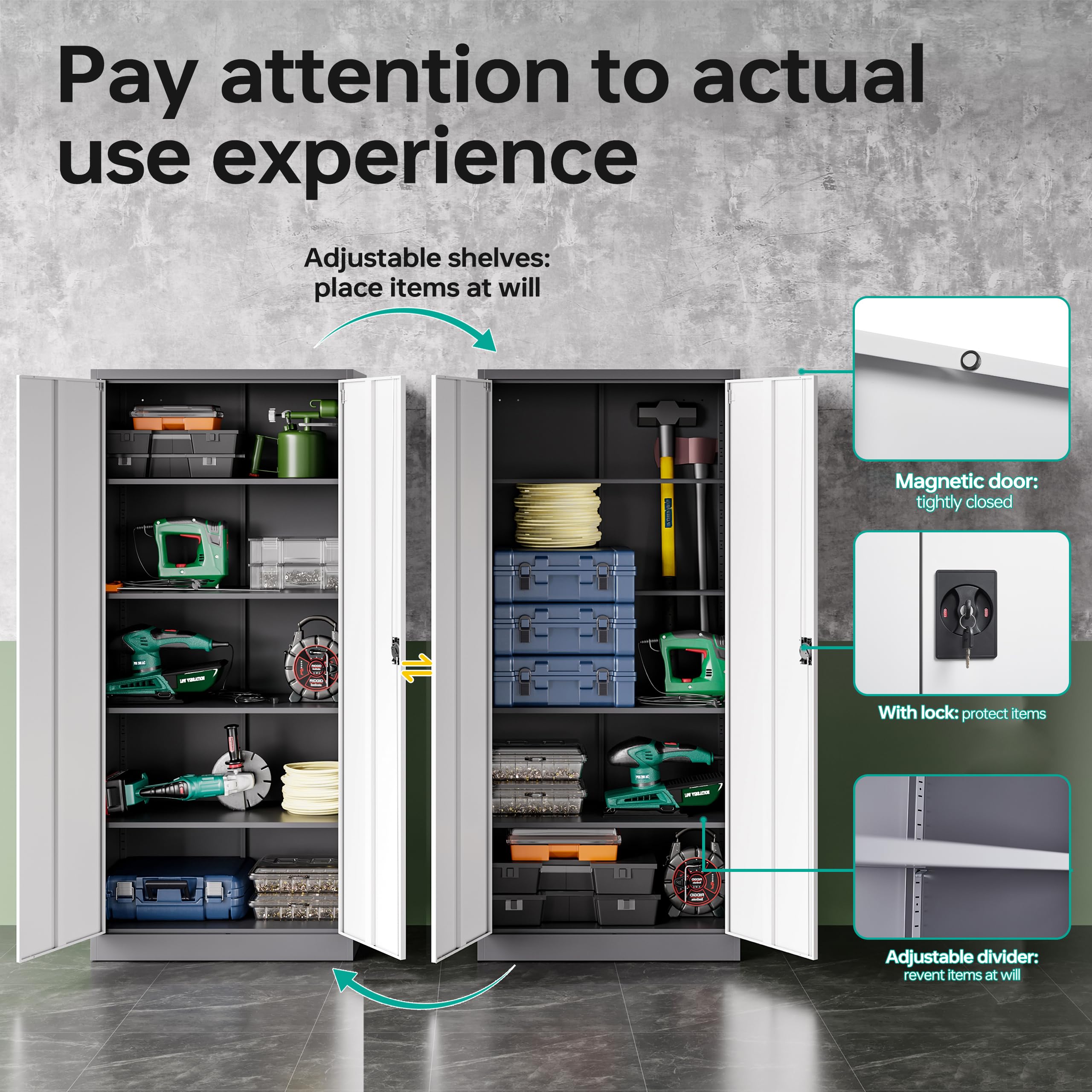 【Large Capacity】: Garage storage cabinet with 4 adjustable shelf to meet your different needs for placing items, shelf and door lock can highly protect items from temperature, dirt and dust