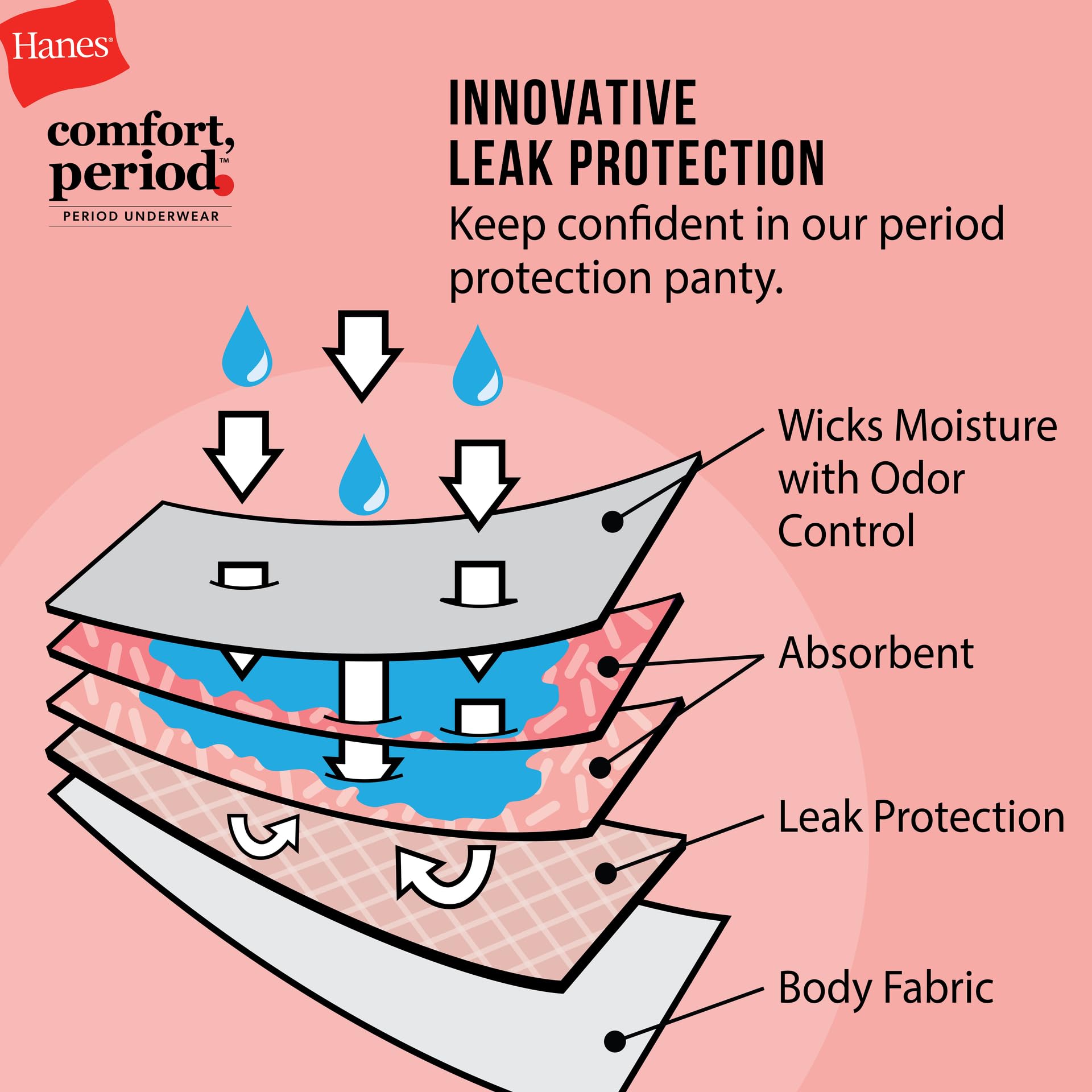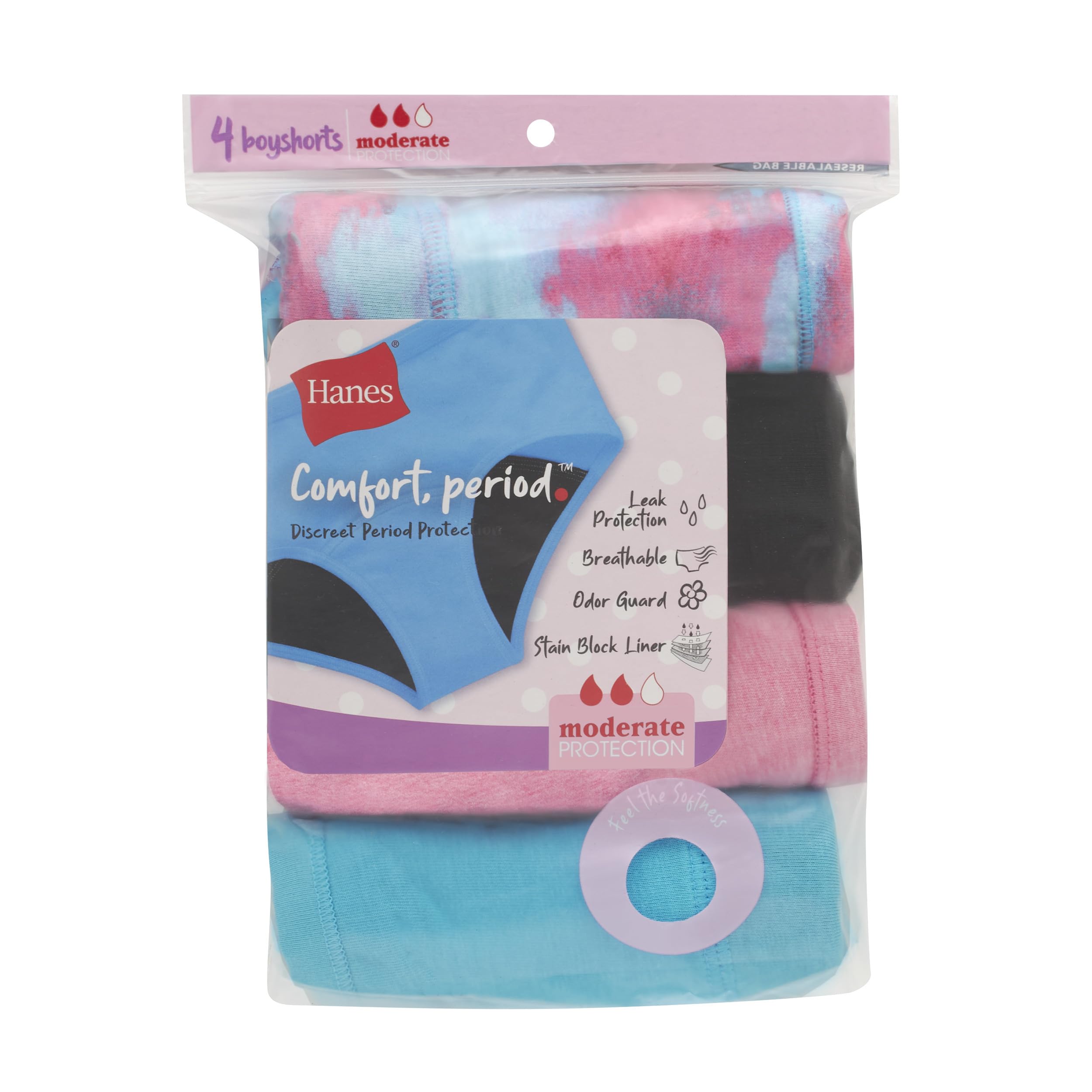 Description Say goodbye to bulky pads and liners with Hanes® girl’s Comfort Period.™ hipster panties. Designed for moderate protection, the breathable 5-layer liner works to eliminate odors and stains for all-day comfort. The no-ride-up style offers a smooth pinch-free waistband so she can move easily and freely. Finished with a Tagless® interior for an itch-free style she’s sure to appreciate. Stock up with this convenient Hanes® 4-pack in an array of colorful solids and prints.