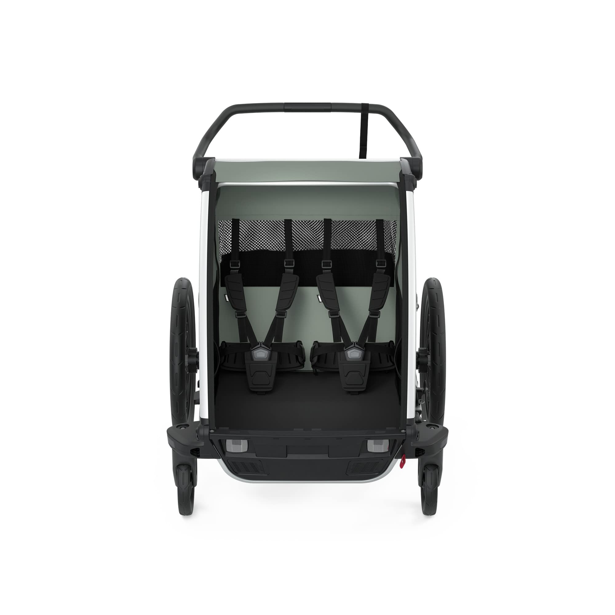 Enjoy strolling, biking, jogging or cross-country skiing as a family with the Thule Chariot Lite. This easy to use multi-sport stroller and trailer spans four seasons and four activities. Use as an everyday stroller or easily transition to a bike trailer for family rides (both kits included). The all-terrain stroller also transitions into a jogging stroller and a ski pulk for cross-country skiing adventures (kits sold separately). Adjustable suspension, a comfortable seat and ventilation vents for circulation provide a comfortable ride for your child on any outing and in any climate. The oversized wheels easily glide over any terrain and the unique compact fold make this bicycle trailer easy to transport and store.