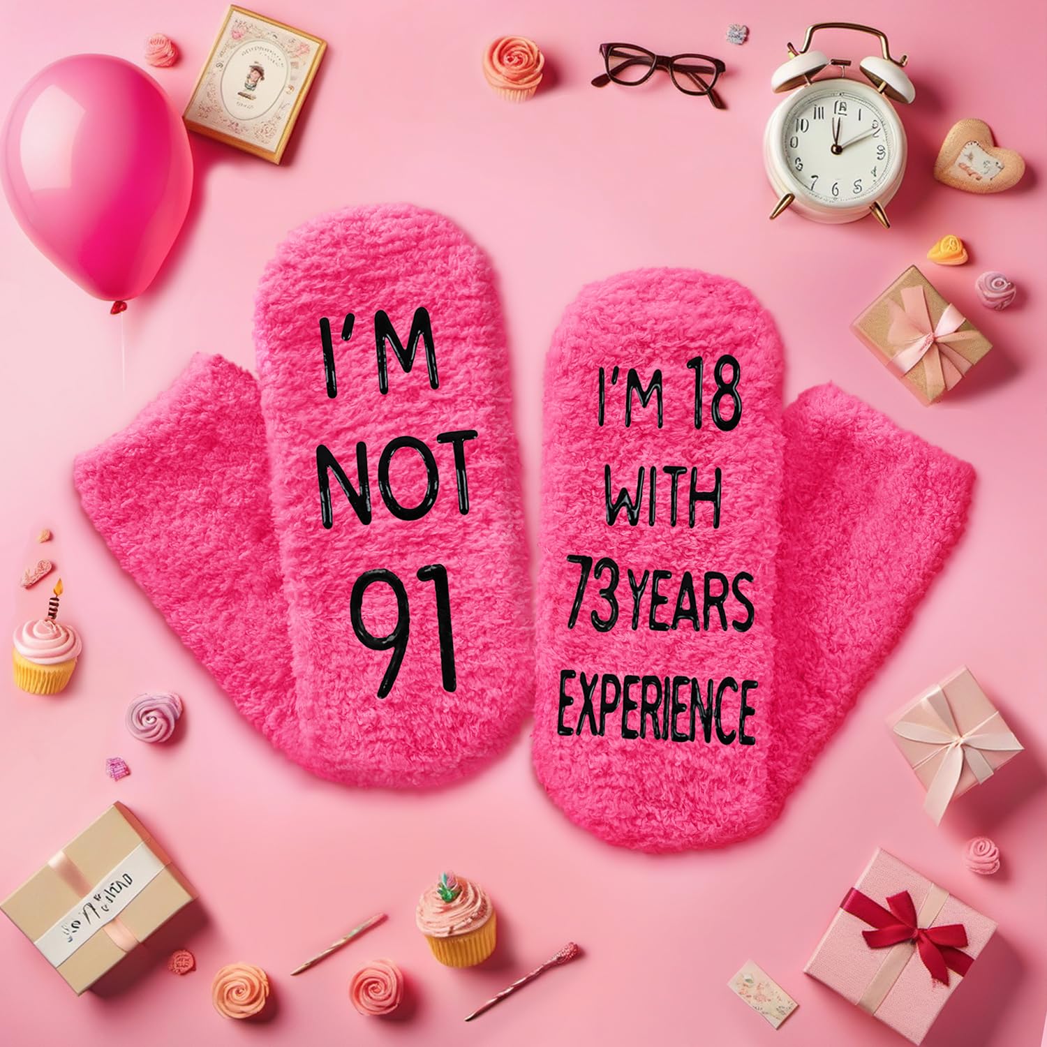GIFTS FOR WOMEN IN THEIR 91S: Say it with socks - "I'M NOT 91, I'M 18 WITH 73 YEARS EXPERIENCE." These are suitable for elderly senior citizens, and older people.