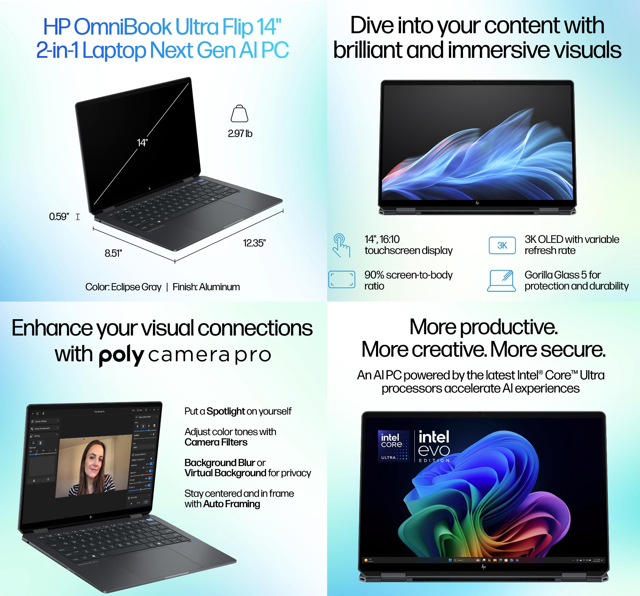 Processor: Ultra 7-258V 2.20GHz Processor (15th Gen, upto 4.8 GHz, 12MB Cache, 8-Cores, 8-Threads, 4 Performance-cores) Storage: 2TB PCIe SSD (Solid State Drive) Memory: 32GB OnBoard LPDDR5X RAM Graphics: Intel Arc shared Integrated Graphics, Operating System: Windows 11 Home-64 Connectivity: 802.11be, Bluetooth 5.4, Camera: Webcam Input/Output: Fingerprint, Blue, Backlit KB Standard Keyboard Active Pen, Display: 14.0" OLED 2.8K (2880x1800) 120Hz 16:10 Touchscreen Display Ports/Slots:, 2 Thunderbolt 4, USB 3.2 Type-C, Headphone/Microphone Combo Jack Battery: 65W PSU, Type-C Power-In, 4-Cell 64 WHr Battery Color: Atmospheric Blue Form/Style: Standard Product Dimensions (WxLxH): 8.5 IN x 14.4 IN x 0.5 IN Weight: 2.9lb