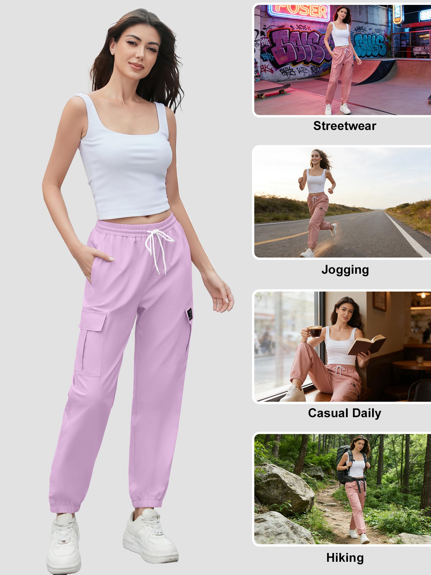 Design: It adopts an elastic ankle strap that fits the ankle well,is neat and fashionable,and convenient for exercise. A variety of pocket designs combine practicality and decoration. The elastic band waist design ensures no restraint when wearing and perfectly fits your curves. It adopts a conical cut,with a wider top and a narrower bottom. The hip and thigh areas are loose and comfortable,enhancing the shape of the legs and allowing for free movement. It is suitable for different body types.