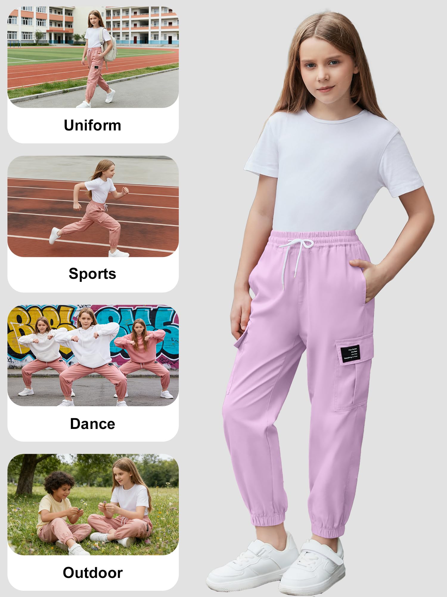 Material: 97% cotton and 3% polyester,Material of cargo pants designed for women and girls,breathable,wear-resistant,providing comfort throughout the day.