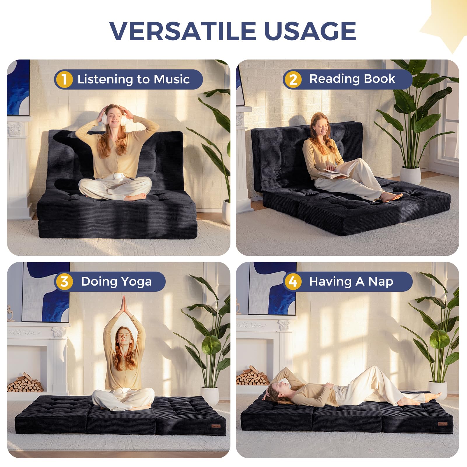 Tri-Fold Mattress: Our foldable triple-fold mattress can be easily unfolded into a spacious and comfortable seat cushion. When folded, it is compact and takes up little space. Whether it's for indoor lounging, picnics, yoga, or everyday home use, it's effortless to use and allows you to enjoy comfort anytime, anywhere