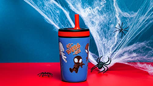 This leak-proof tumbler from Zak Designs makes hydration fun for any Marvel fan! Durable Materials: The tumbler is made from food-grade, 18/8 stainless steel, and the comfortable straw is made from silicone. Everything is completely BPA free, and the lid can be disassembled for easy cleaning. Leak-Proof Straw: The straw spout has a built-in valve that allows liquid to flow when drinking and prevents spills when the tumbler is tipped over. It's perfect for travel or for young children graduating from sippy cups. Vacuum Insulation: The stainless steel tumbler has vacuum insulation that keeps drinks cold for up to 10 hours, so your water is always refreshingly chilled. The double-wall construction also prevents condensation from forming on the outer walls, eliminating messy water rings.Hydrate Anywhere: The tumbler won't splash or leak and fits in car cup holders, making it ideal to take on the go. At home, you don't have to worry about spills or stains around fabrics or electronics, and drinks stay easily accessible through the straw. Specifications: 12 oz capacity. Vacuum insulated. Made of durable stainless steel and silicone. BPA-Free - Zak is committed to safety. Hand wash tumbler, top rack dishwasher safe, do not microwave. Length: 3.2-inch, Width: 3.2-inch, Height: 6.77-inch. Character: Spidey and His Amazing Friends (Marvel Spider-Man).
