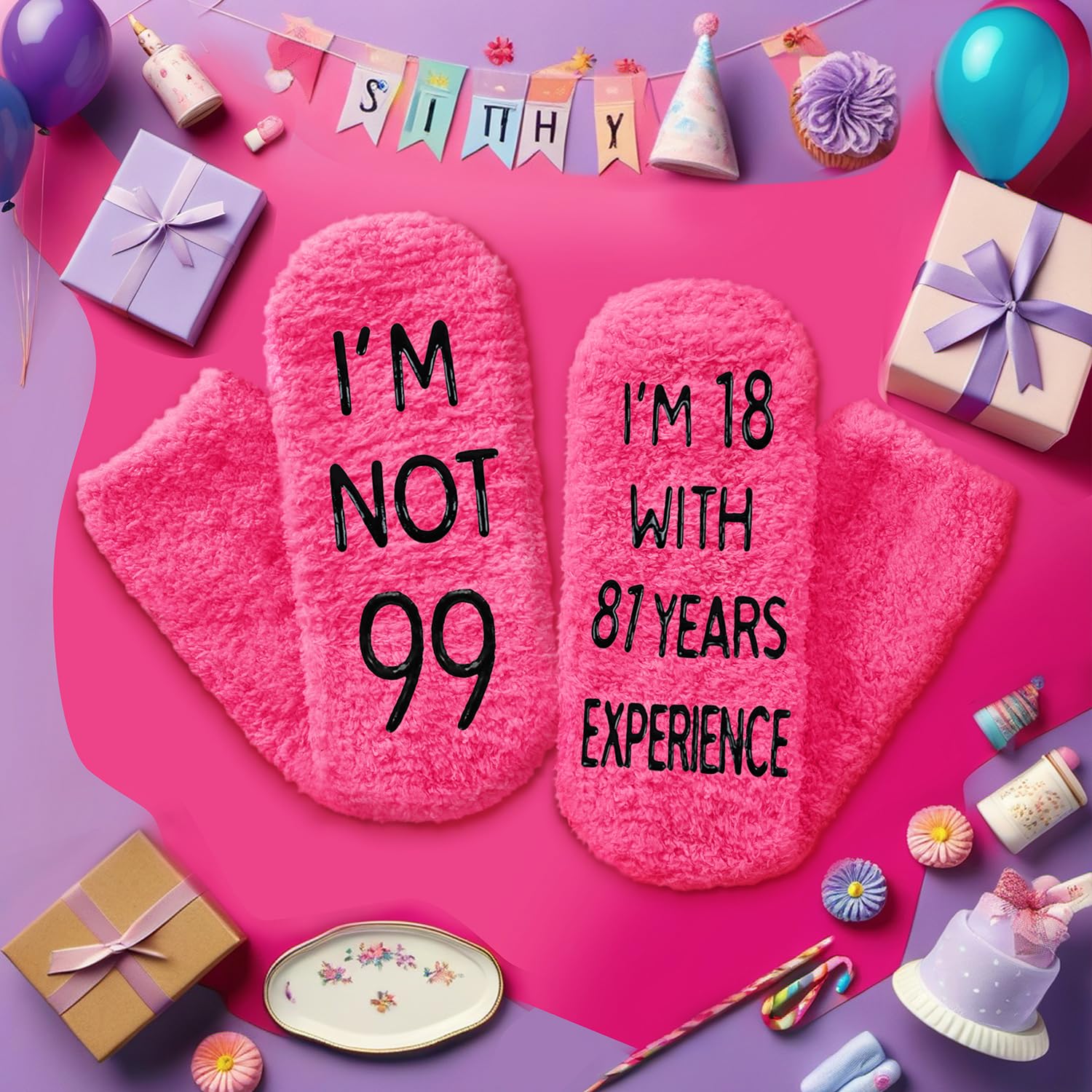 GIFTS FOR WOMEN IN THEIR 99S: Say it with socks - "I'M NOT 99, I'M 18 WITH 81 YEARS EXPERIENCE." These are suitable for elderly senior citizens, and older people.