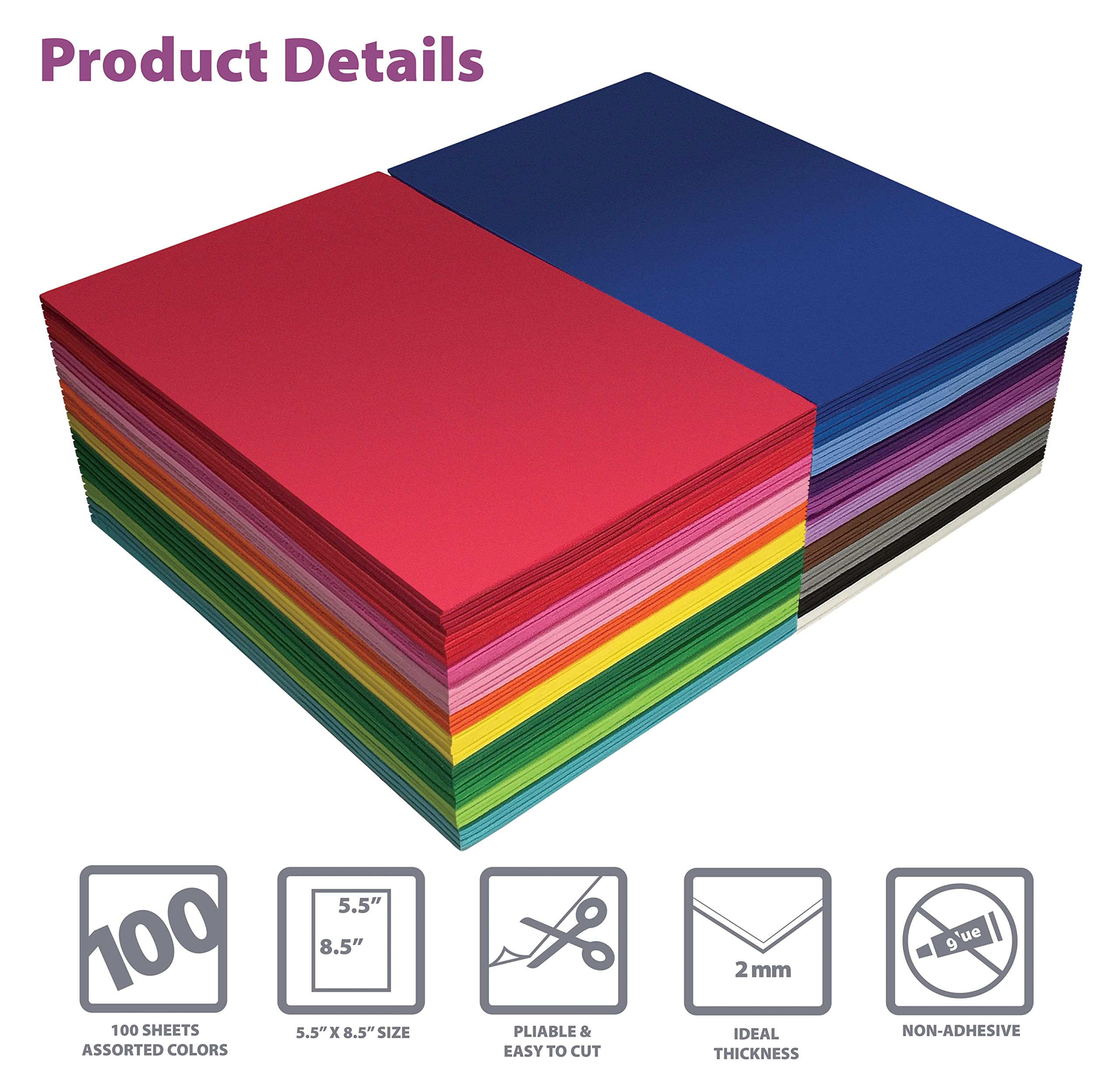 100-PACK: 5.5 x 8.5-inch sheets of colored EVA foam in 20 beautiful colors: 5 each of red, dark red, fuchsia, pink, orange, yellow, green, dark green, lime green, teal, blue, dark blue, light blue, purple, orchid, lavender, brown, gray, black, and white.