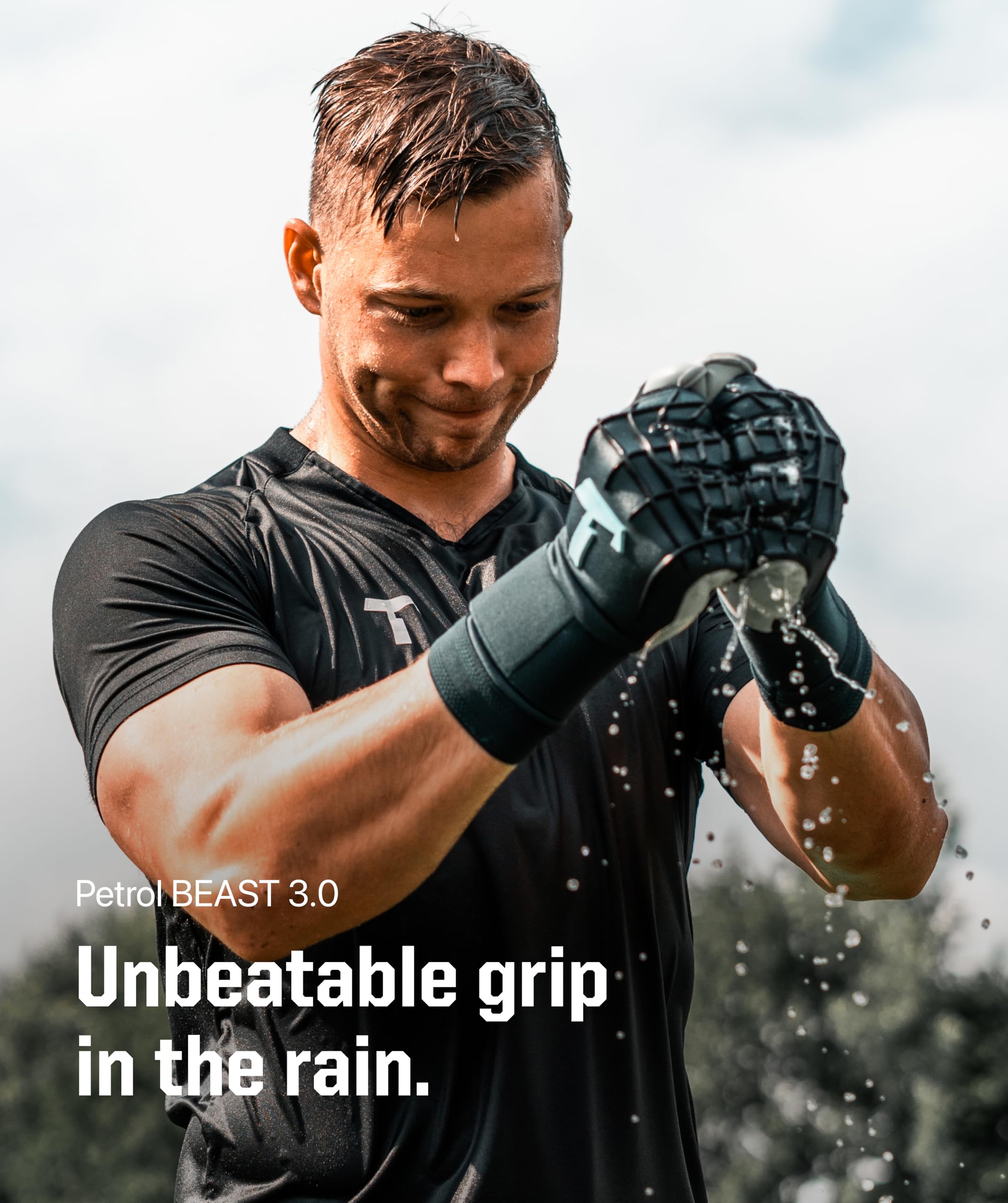No more excuses: The T1TAN PETROL BEAST 3.0 has been specially developed for bad weather. Special 4mm Aqua Grip rain surface. Unreal grip in the rain and good performance in the dry. Breathable and ultra-light Mechano 2.0 material. Increased Catching surface. Completely redesigned silicone punching zone with Beast look. Extended grip foam. Removable strap.