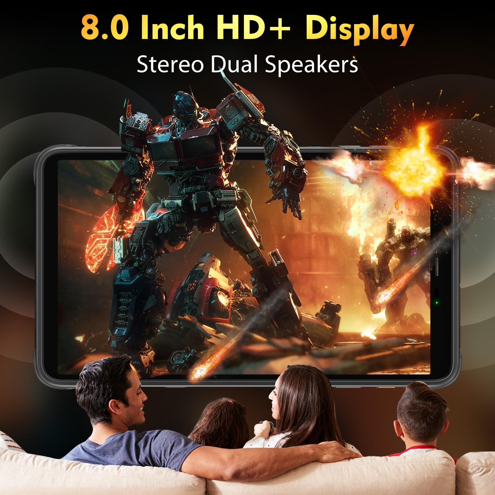 【Dual Speakers & 8.0" Display】The Armor Pad Pro has two separate speakers that sound wider, more detailed, and more realistic for an immersive media experience. Get the job done right in the palm of your hand with the 8.0-inch touchscreen. It's built even tougher than a normal screen, making it ideal for using outdoors or entertaining naughty kids.