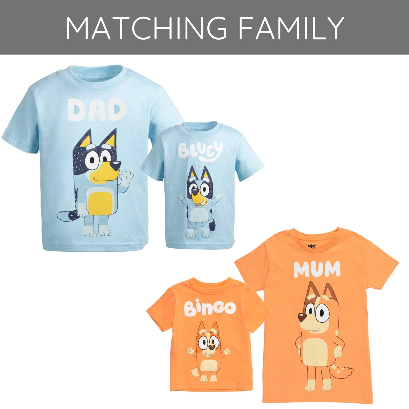 Description Come meet Bluey the 6 year old Blue Heeler pup and her younger sister Bingo! Watch Bluey and Bingo come to life through your little one’s friendly and fun personality. Match with your child in a cute family set of t-shirts featuring a choice of Bluey, Bingo, Chilli, and Bandit artwork!