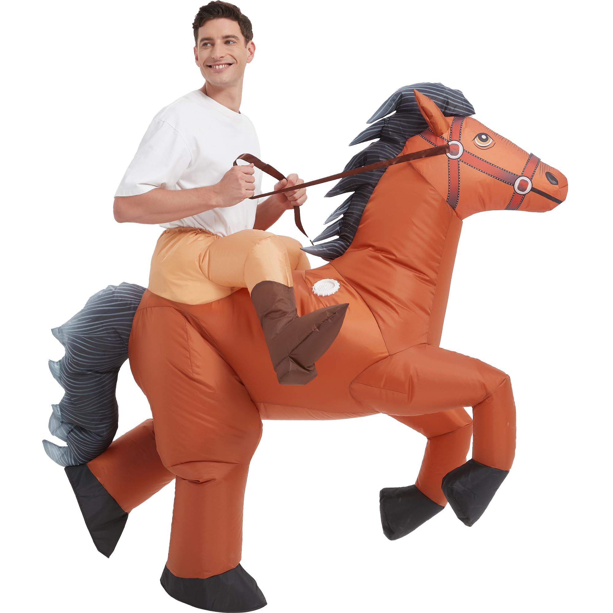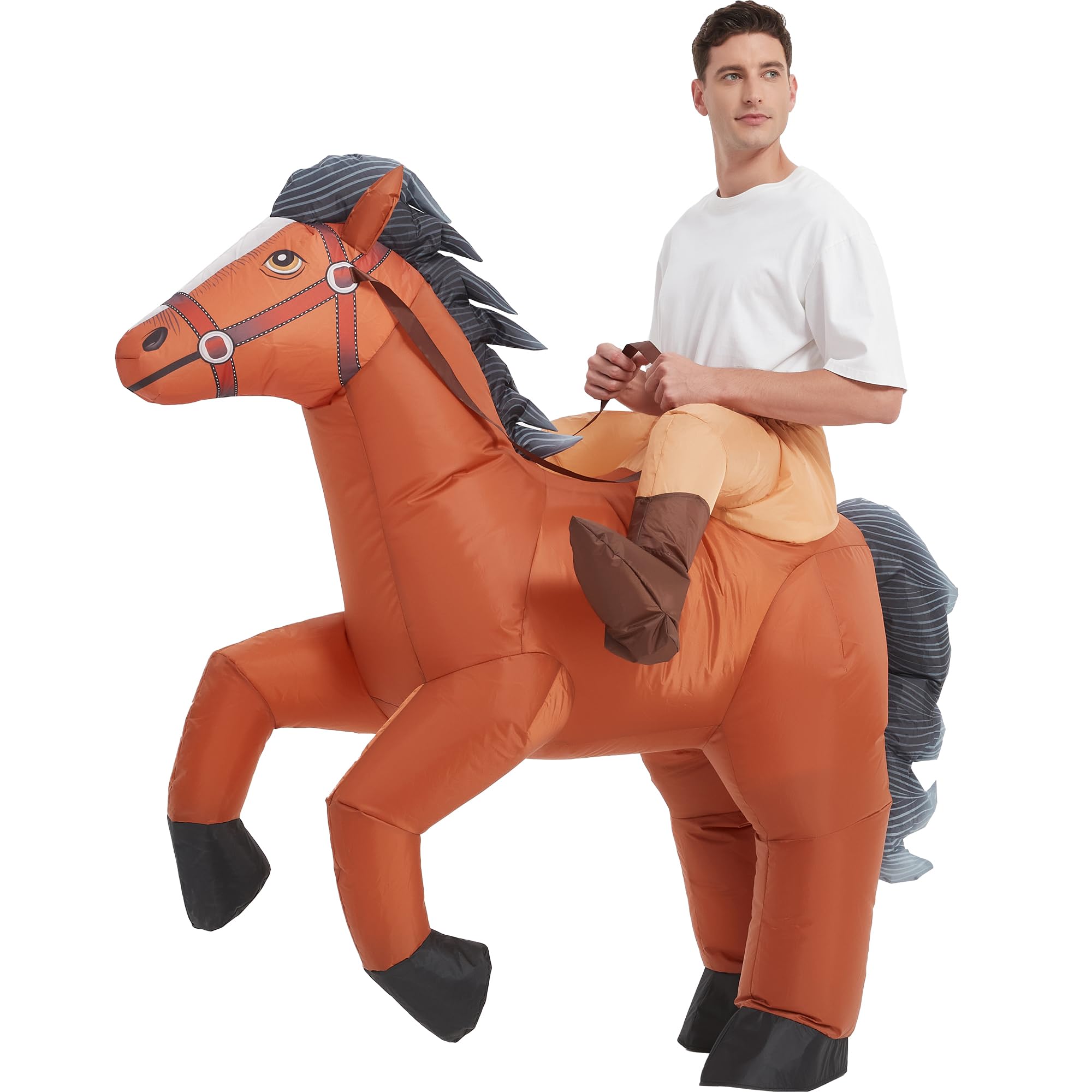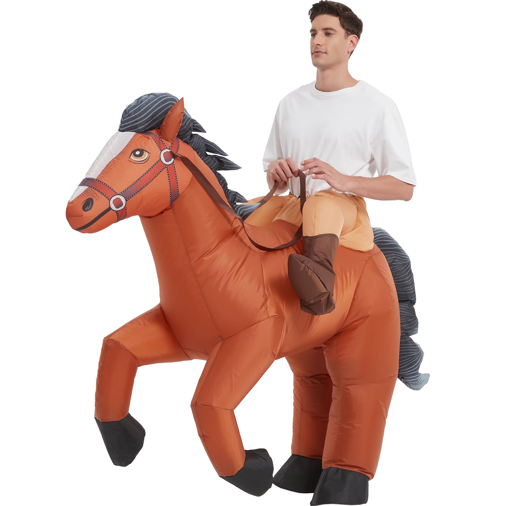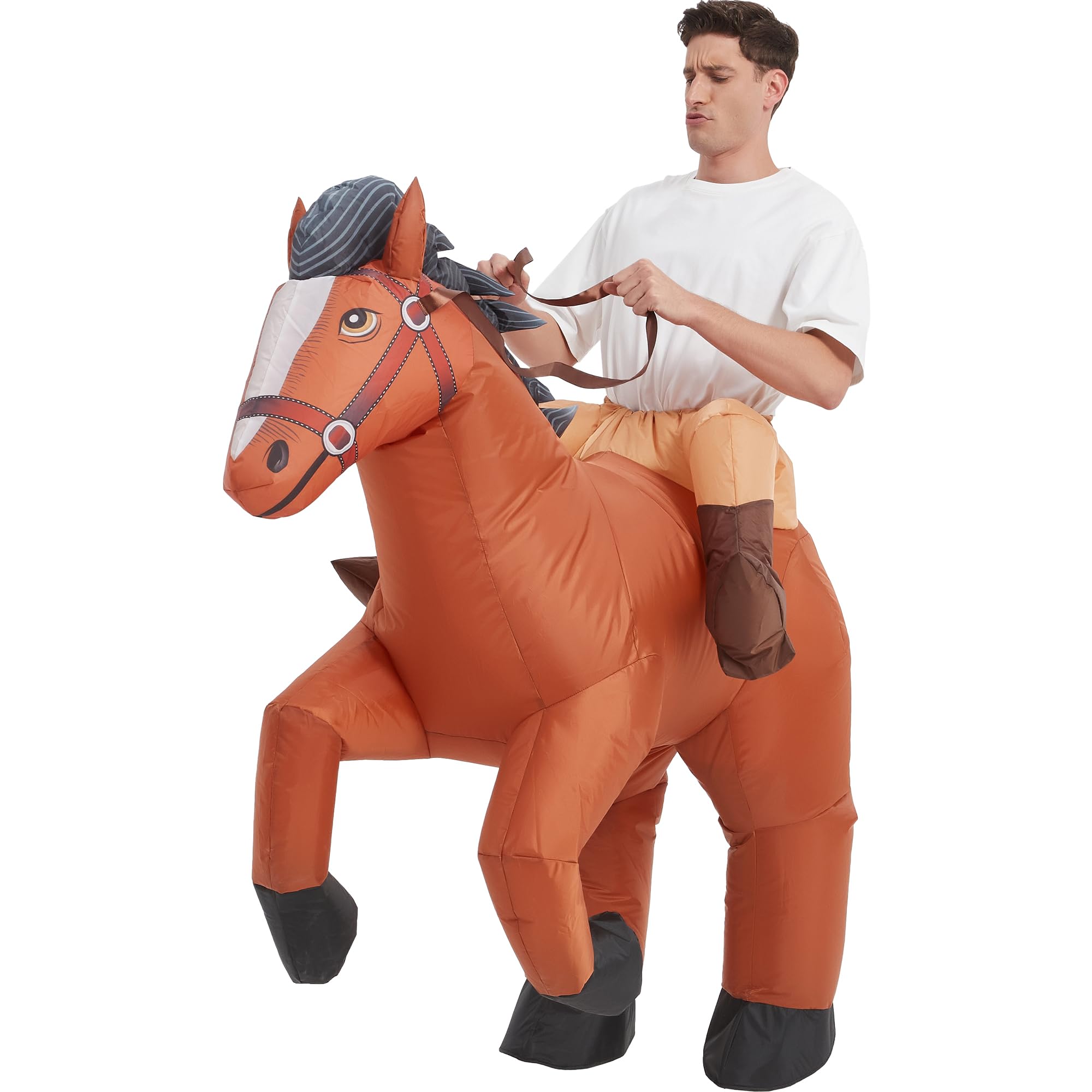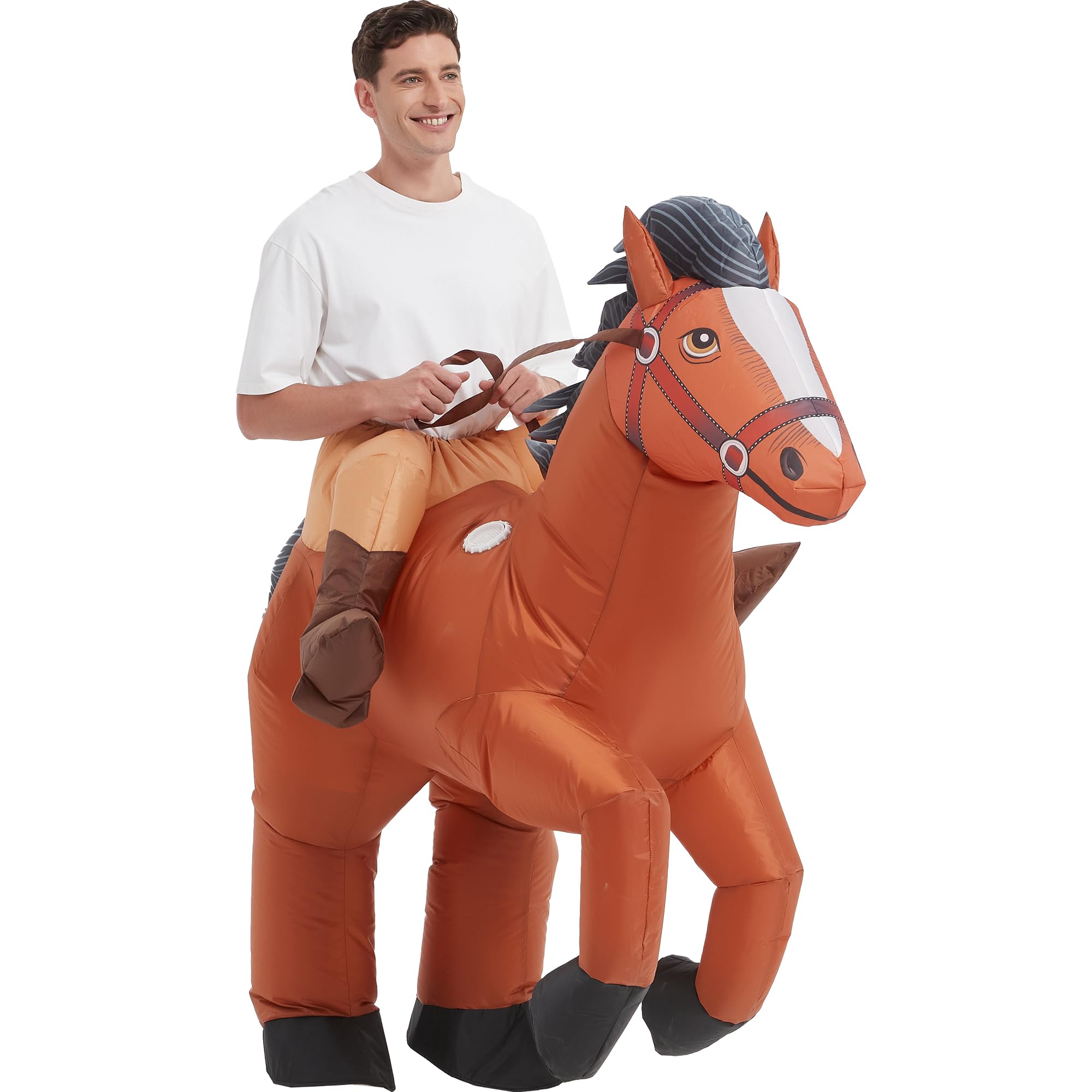 【Excellent Craftsmanship】 The horse costumes for Halloween are made of high strength waterproof polyester which is against rips and tears, the excellent stitching improves the quality of the inflatable costumes. Moreover, our costumes are providing with a powerful-duty blower to continuous airflow inflate the costumes.
