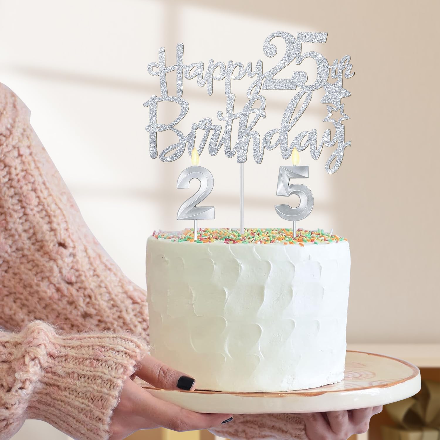 [Silver 25 Cake Topper and 25 Candles]: Silver 25 Birthday Candles in number 2 and 5 And 1Pcs Silver Happy 25th Birthday Cake Topper that are elegant prop to embellish the 25 Birthday party’s cakes and cupcakes. These dreamy silver sweet kit help to create a romantic and elegant 25th birthday celebration. A classical birthday card included will good help to write your love word to the 25 year old women