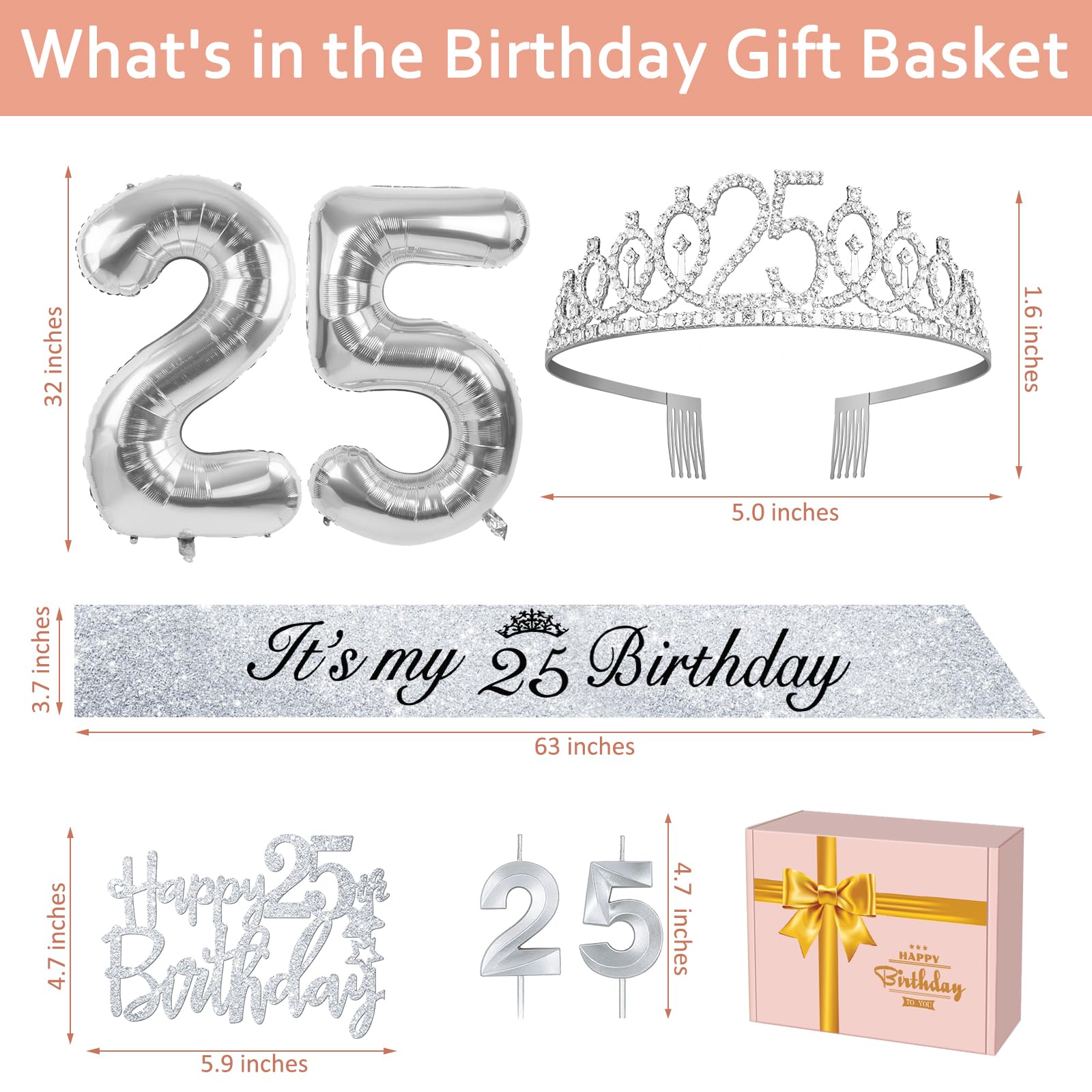 [25th Birthday Decorations Silver]: Coming with 25th Birthday Tiara x 1pc, 25th Birthday Sash x 1pc, Happy 25th Birthday Cake Topper x 1pc, Number 25 Candles x 1set, Big Numeral 25 Balloons x 1 set, Classical Birthday Card x 1pc. This valuable Silver 25th birthday gifts for women has been packed in a beautiful gift box for thoughtful presentation. Don't forget to leave her a message! Select "THIS ORDER CONTAINS A GIFT" at checkout and add a personalized gift message with your name