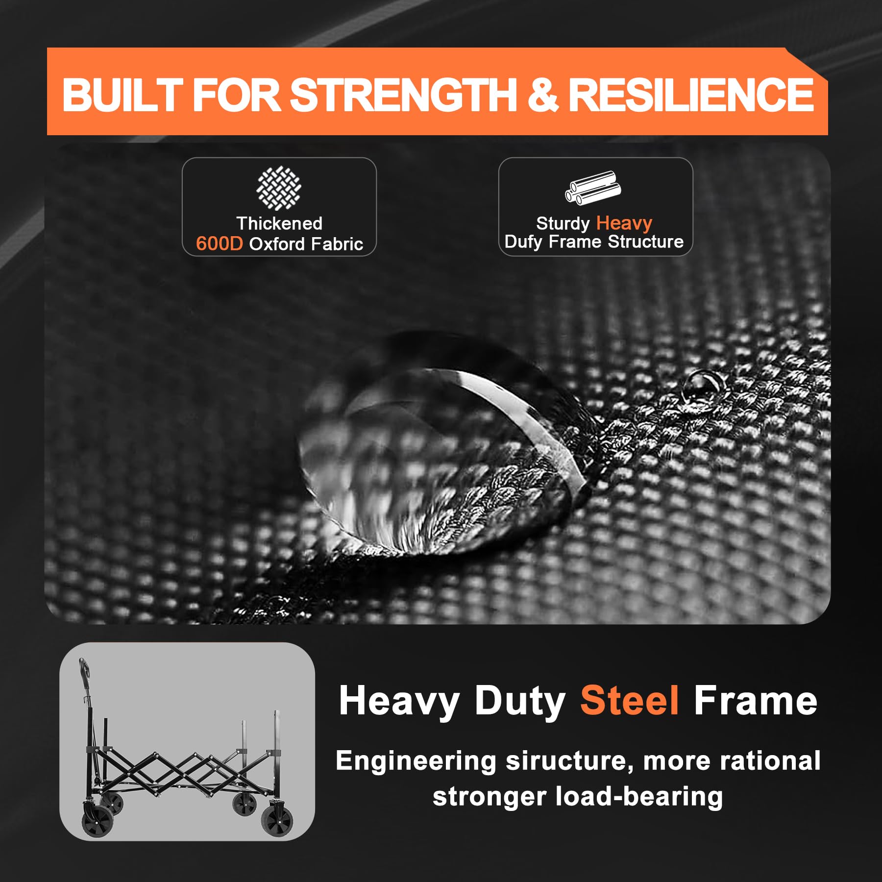 EXTRA LARGE CAPACITY - DURABLE COLLAPSIBLE WAGON: The collapsible wagon has an expansion size of 57.56"x 17.72"x 37.8" (L*W*H) and load up to 350LBS, which can carry all the goods your family needs for outdoor camping