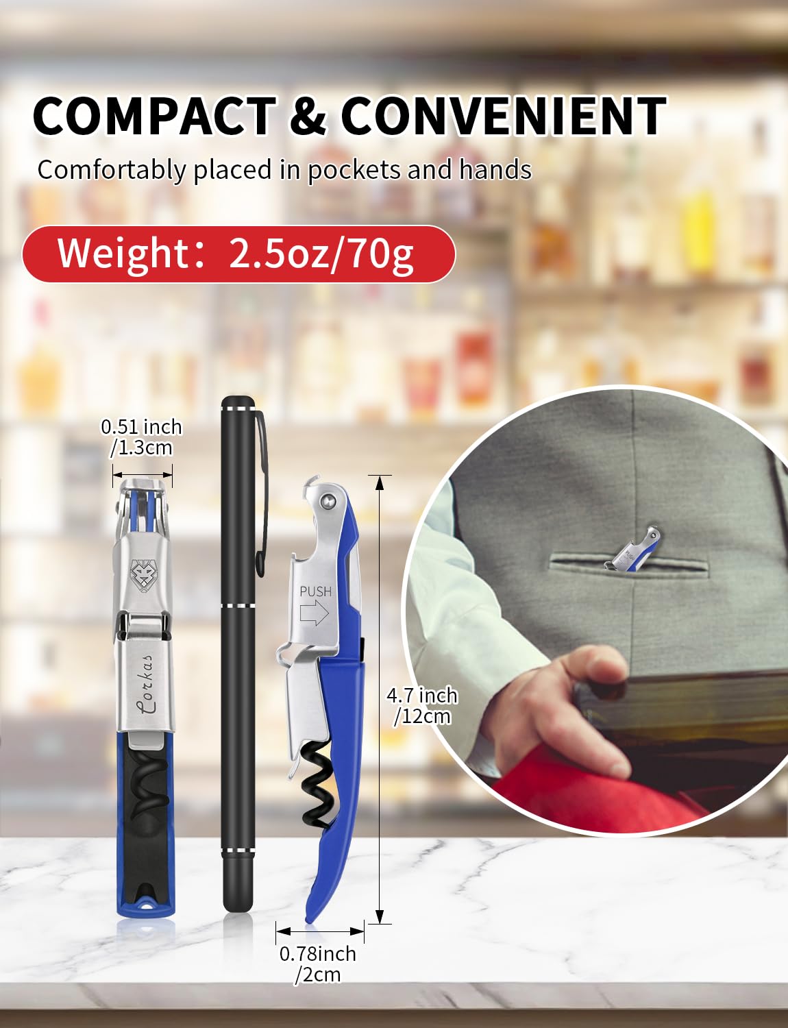 ✅【POCKET-SIZED POWERHOUSE FOR WINE LOVERS】Don't be fooled by its size! This meticulously handcrafted corkscrew (4.7" x 0.78") is a powerhouse in disguise. Despite its compact design with weight only 2.5 ounces. The tighted pivot points, optimized curvature of the handle ensure heavy duty and comfortable to use. It effortlessly tackles any cork, at home, at gatherings, or even on picnics. This wine key fits comfortably in your hand and pocket, always ready to elevate your next wine experience.