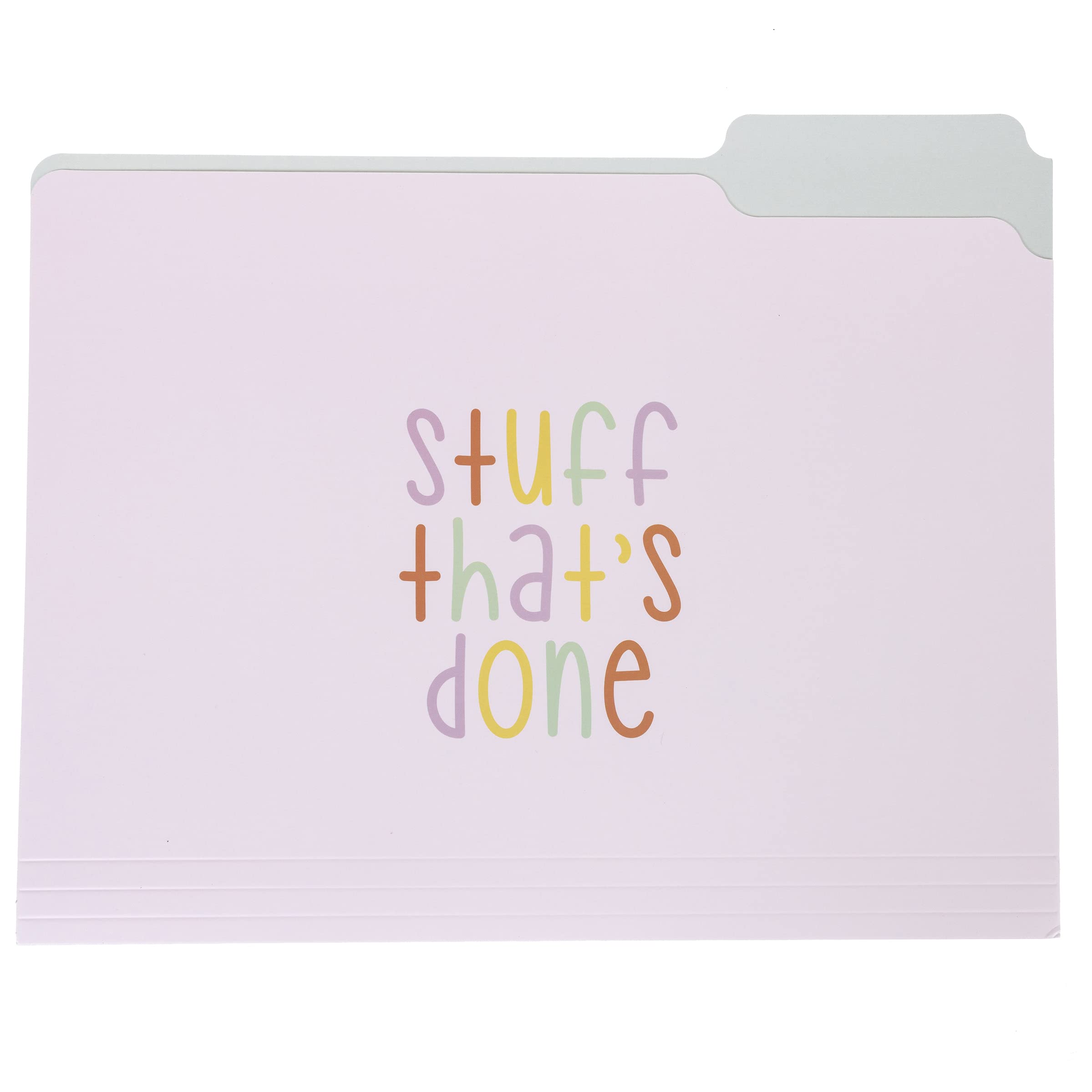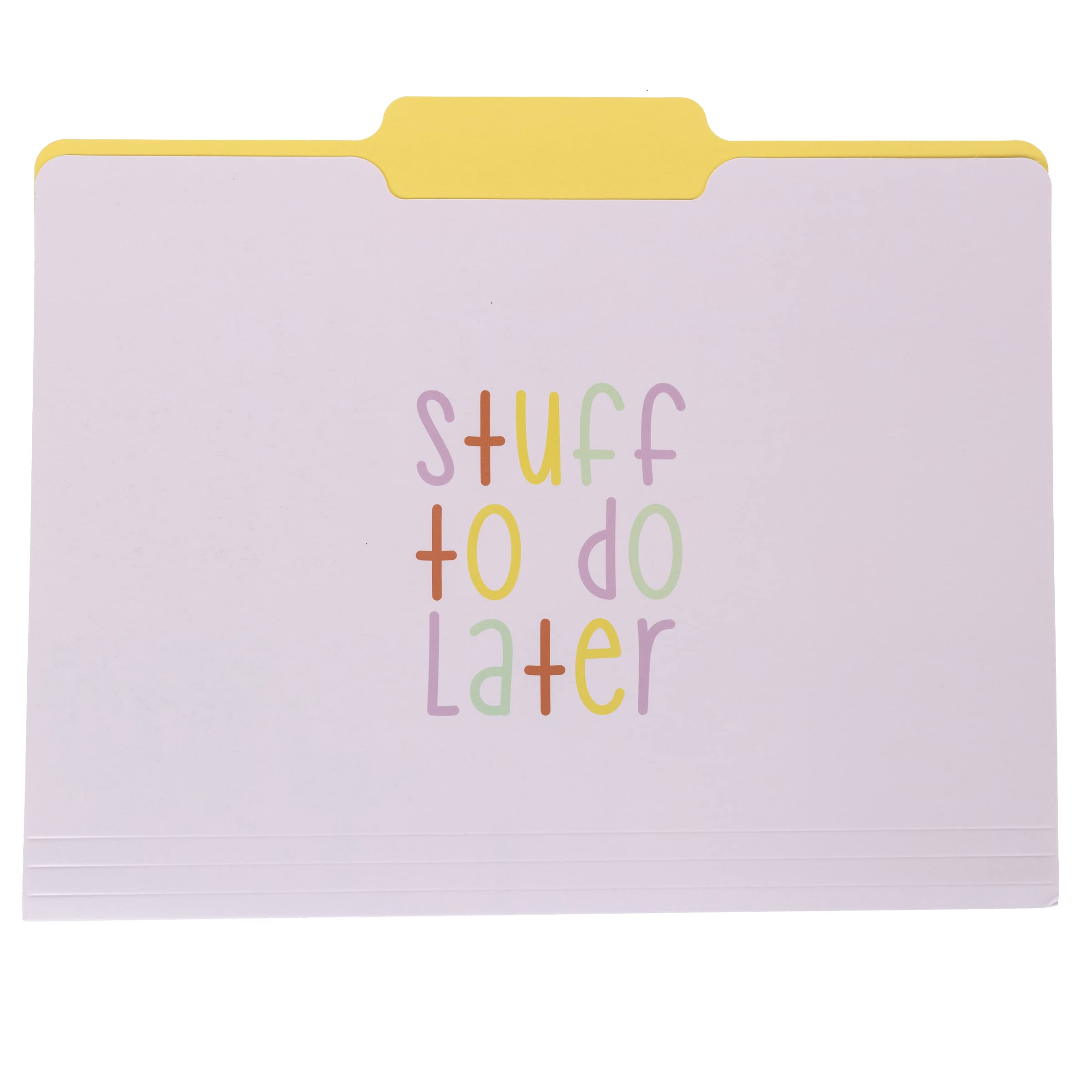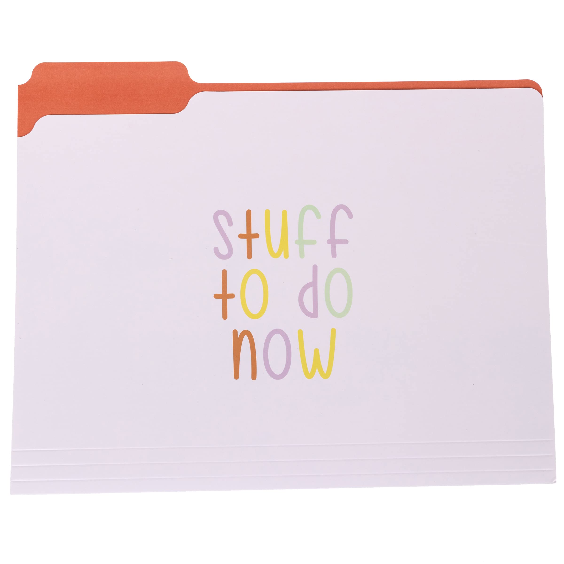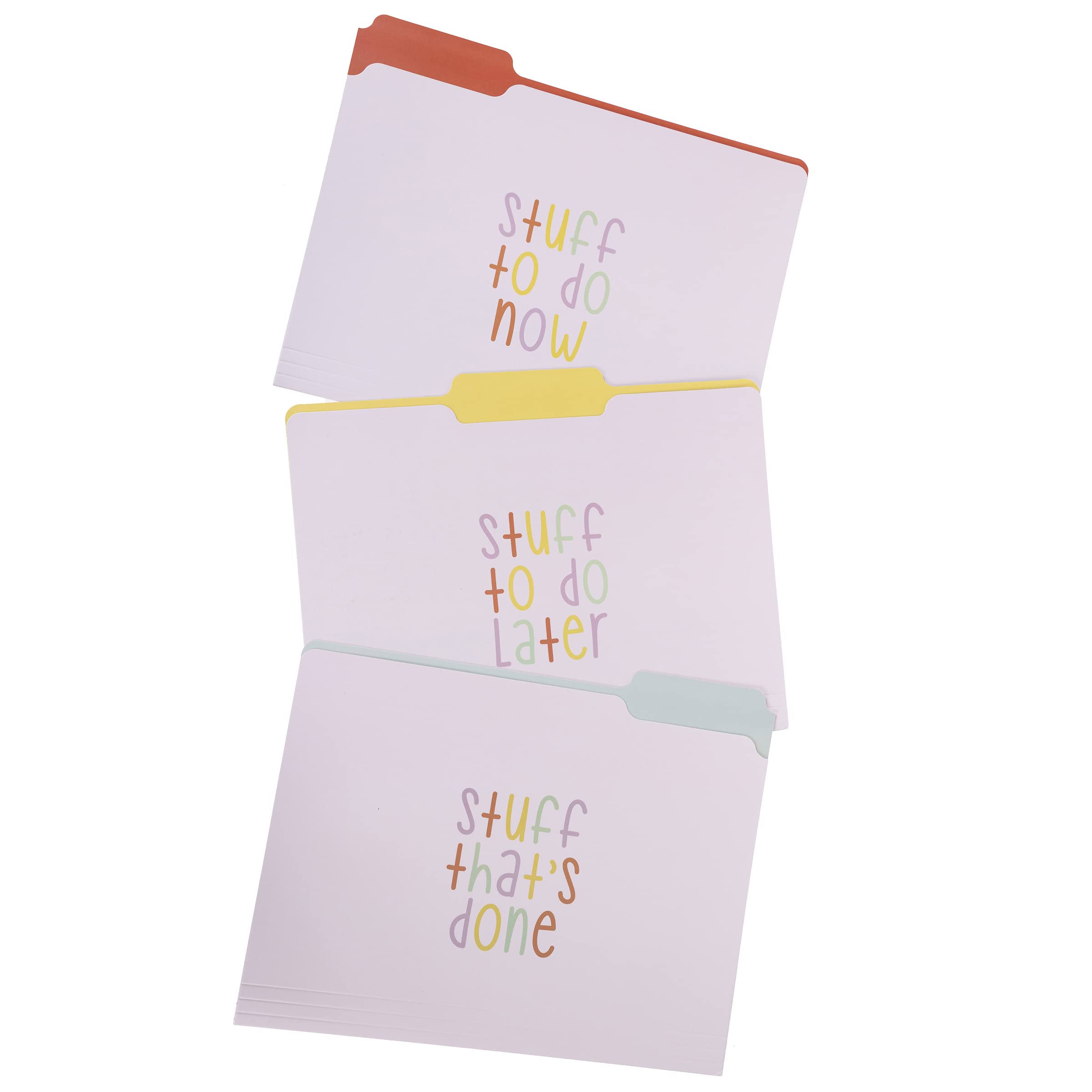 STAY PRIORITIZED These organizing file folders keep you focused on tackling key projects first followed by the others on your to-do list. Decorative script on these colorful folders include: “stuff to do now”, “stuff to do later”, and “stuff that’s done”.