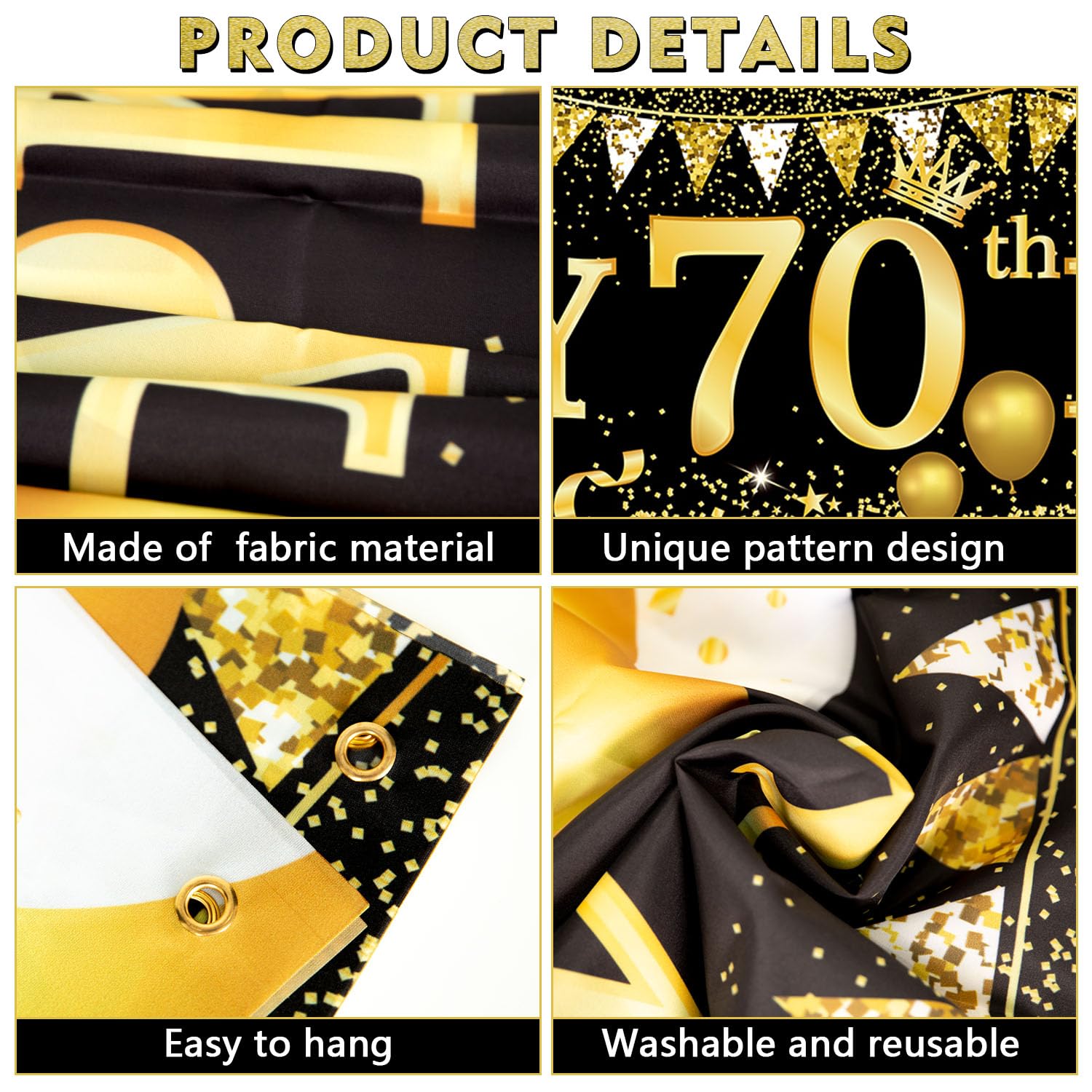 🎉【Easy to Use】The 70th birthday decor banner has 4 copper holes in the 4 corners. With the black ribbon we provide. It can be easily hung on the walls, tree, fences and anywhere you want, very convenient to use and save your time at the party decoration. You can also hang this happy 70th birthday banner and balloons the indoors and outdoors as a sign of welcoming guests