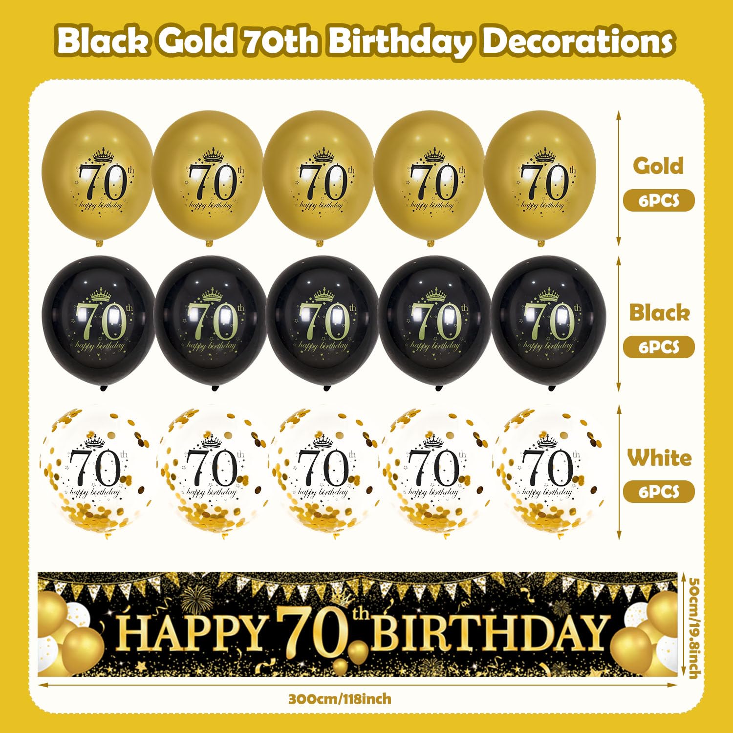 💖【70th Birthday Decorations Set 】Our 70th birthday Decorations package contains a large black gold happy 70th birthday banner and 18pcs birthday balloons with a ''70th Happy Birthday'' pattern. The 70th birthday banner measures 300*50cm/118x19.8 Inch, large enough for you to decorate your party. It is very suitable as a decoration for your 70th birthday party decorations, give a unique glow to your party