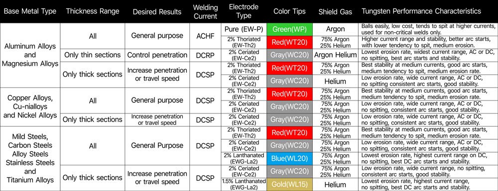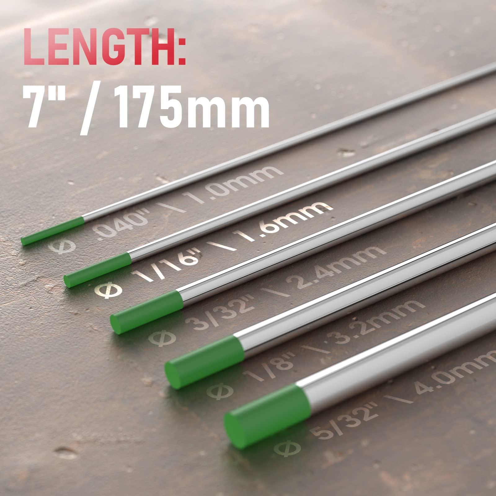 GREEN-PURE TUNGSTEN: The original pure tungsten electrode contains at least 99.5% tungsten and delivers all of the properties classically associated with tungsten - superior conductivity, durability, and performance. It suits AC welding of heavy load conditions only.