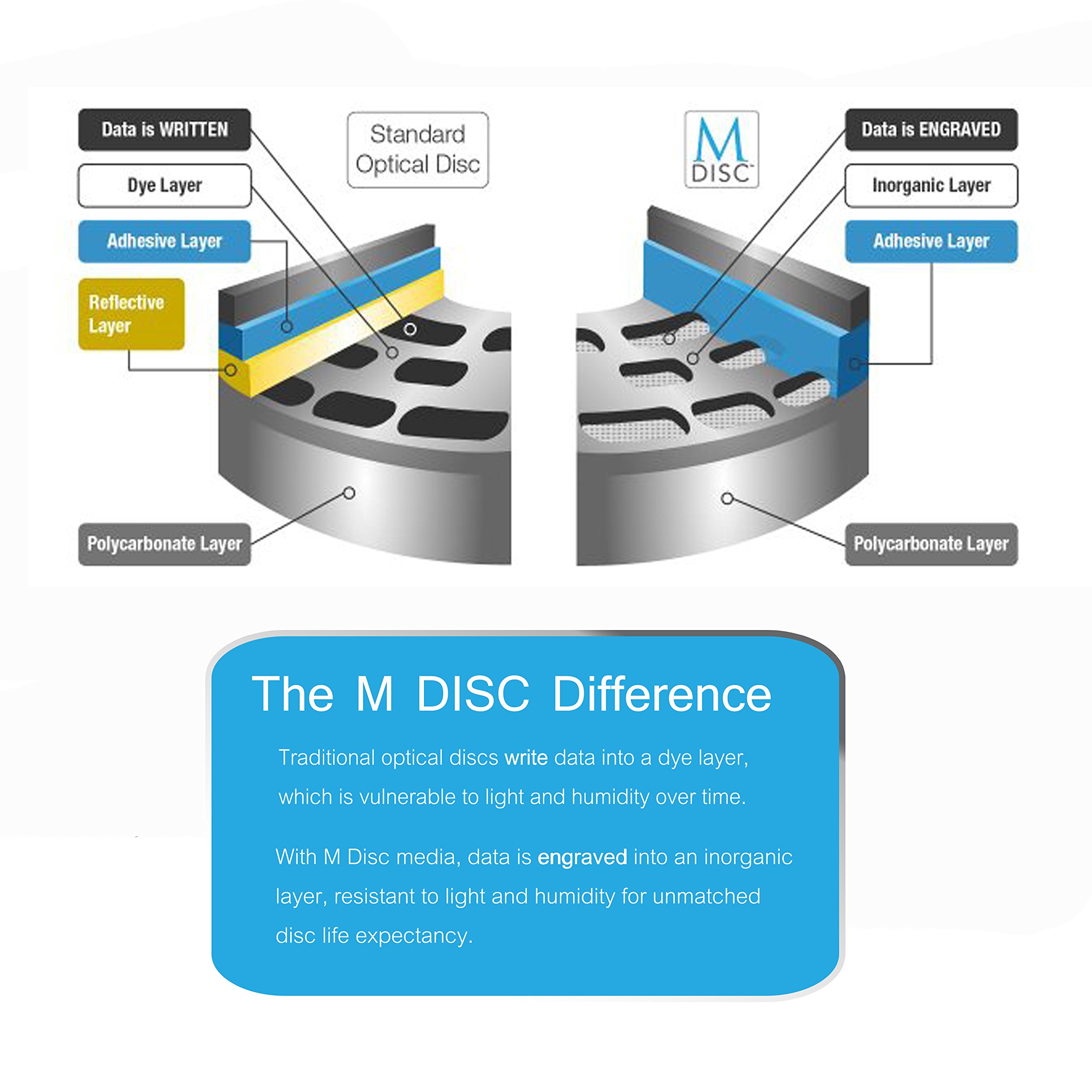 Longevity - with Verbatim M disc, information is engraved into a patented, inorganic recording layer resistant to light, temperature and humidity. M disc media has a projected lifetime of several hundred years –up to 8x that of most LTO media and up to 60x that of hard disc drives.